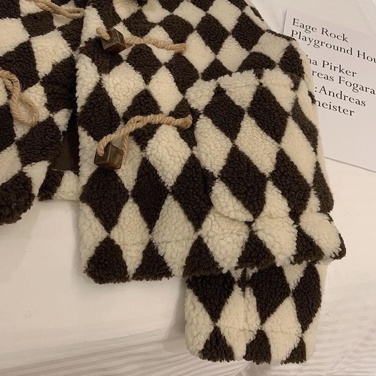 チェッカーボード柄 ラムウールコート ボアコートラムウールショート. ラムベルベット コート ジャケット アウター 秋冬 2カラー a4014