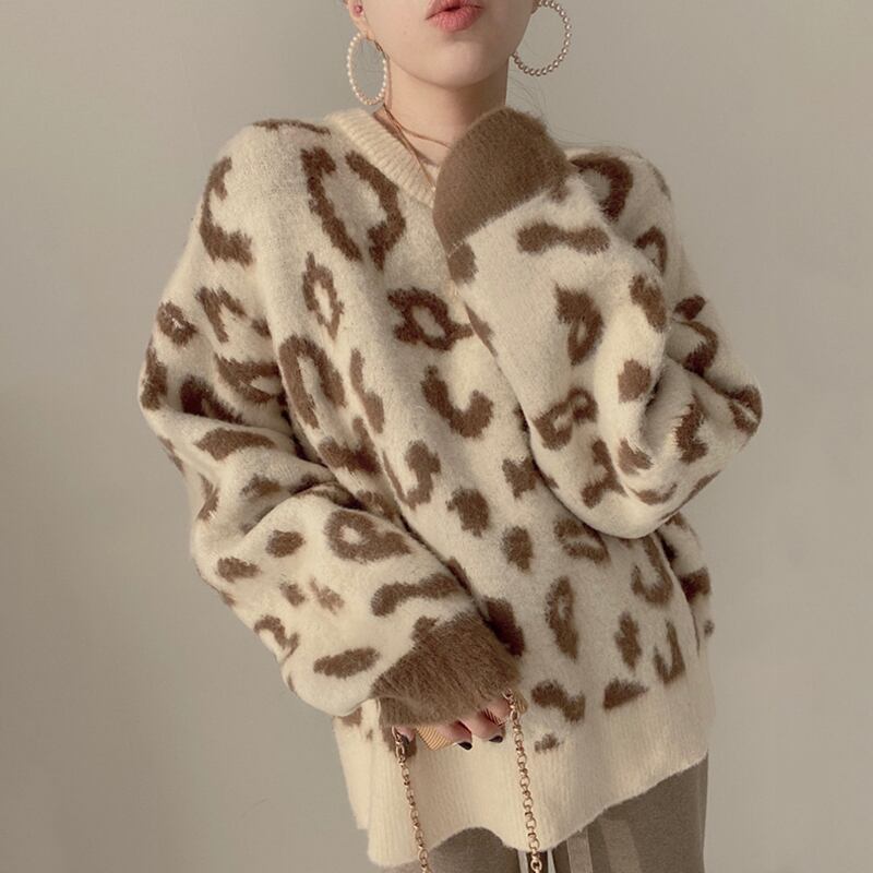 プルオーバー レオパード柄ニット ニットセーター トップス セーター クルーネック ニットセーター ヒョウ柄 レトロ ラウンドネック. 4カラー a4017