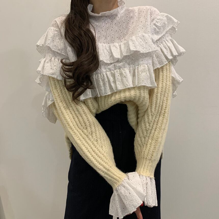 レースステッチニットセーター フレアスリーブ ニット セーター プルオーバー レトロ 韓国 スタンドカラー 3カラー a4019