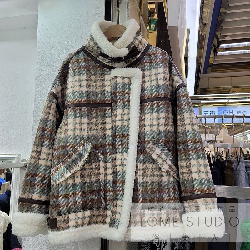 チェック柄 ボアウールジャケット ボアウールコート ジャケット コート アウター ベルベット ルーズ スタンドアップカラー 2カラー a3914