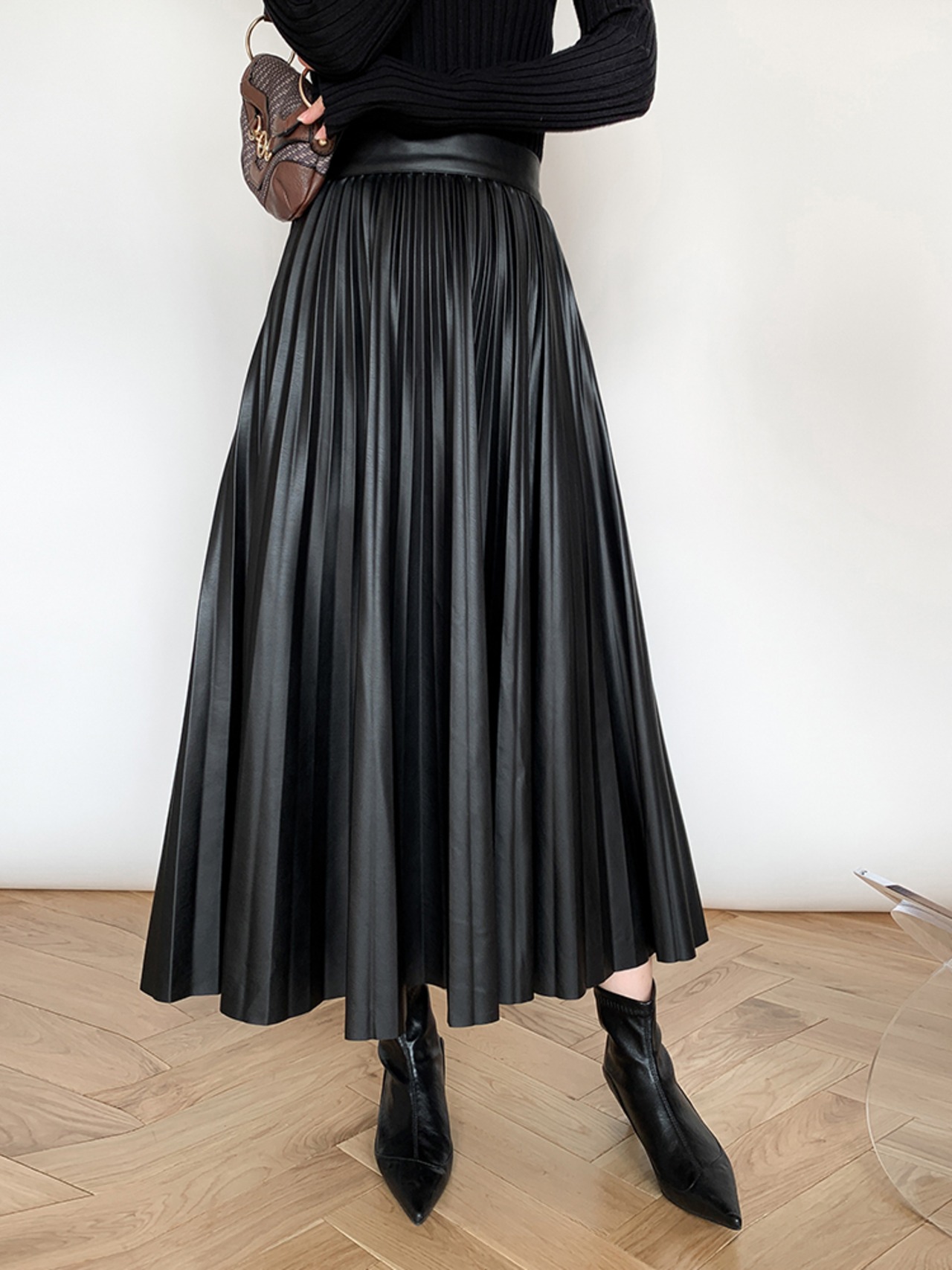 レザープリーツスカート プリーツスカート ハイウエスト Aラインスカート ロング丈 プリーツ PU レザー スカート エコレザー a3918