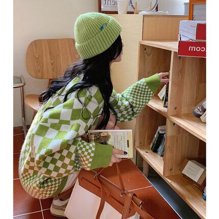 チェッカーボード プルオーバーセーター ニット セーター ラウンドネック ルーズ 韓国 シック 秋冬 2カラー a4070