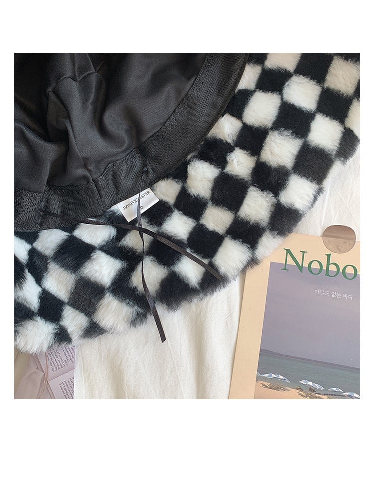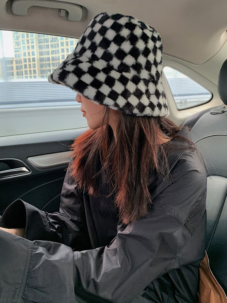 フェイクファーチェッカーハット チェッカーボード ファーハット ハット 帽子 春 秋 冬. a3725
