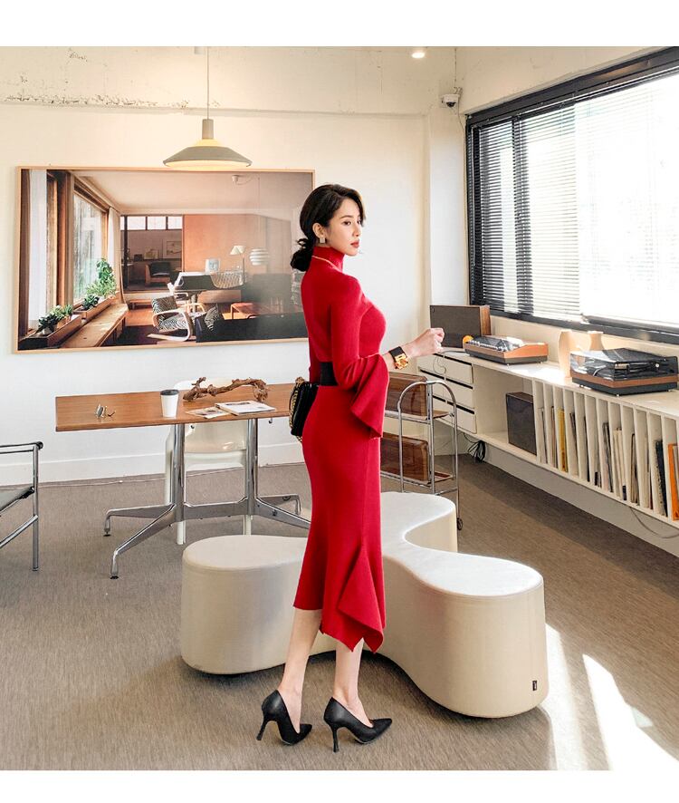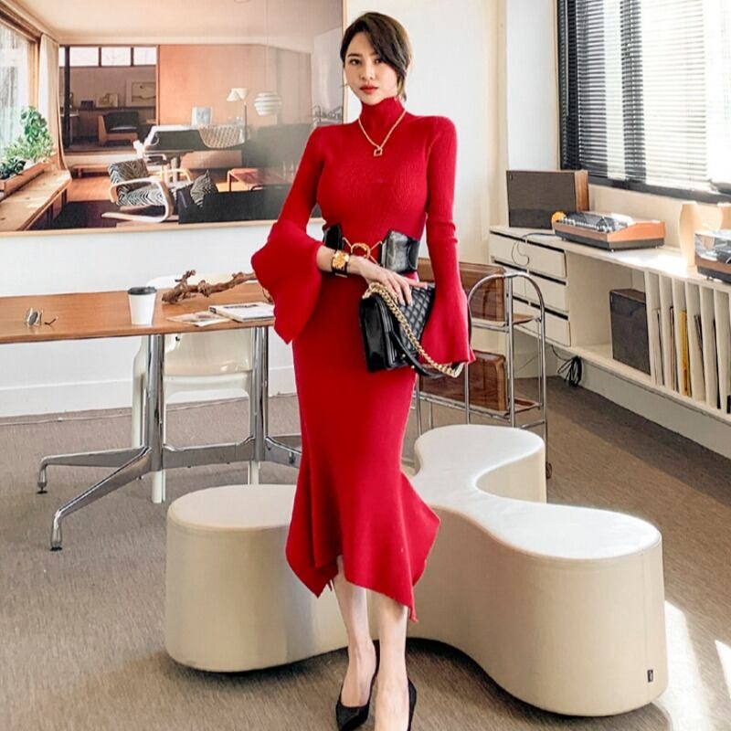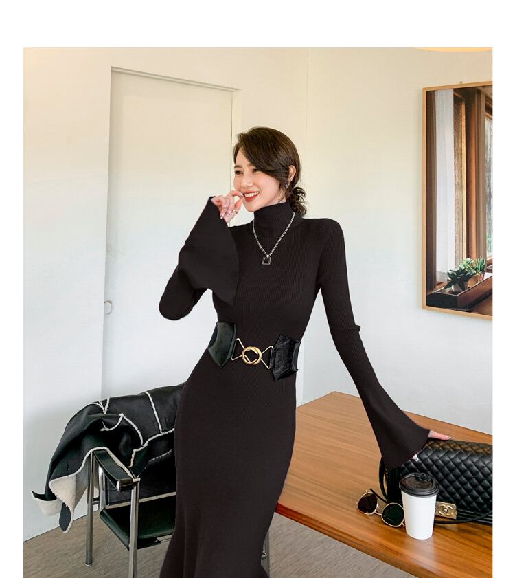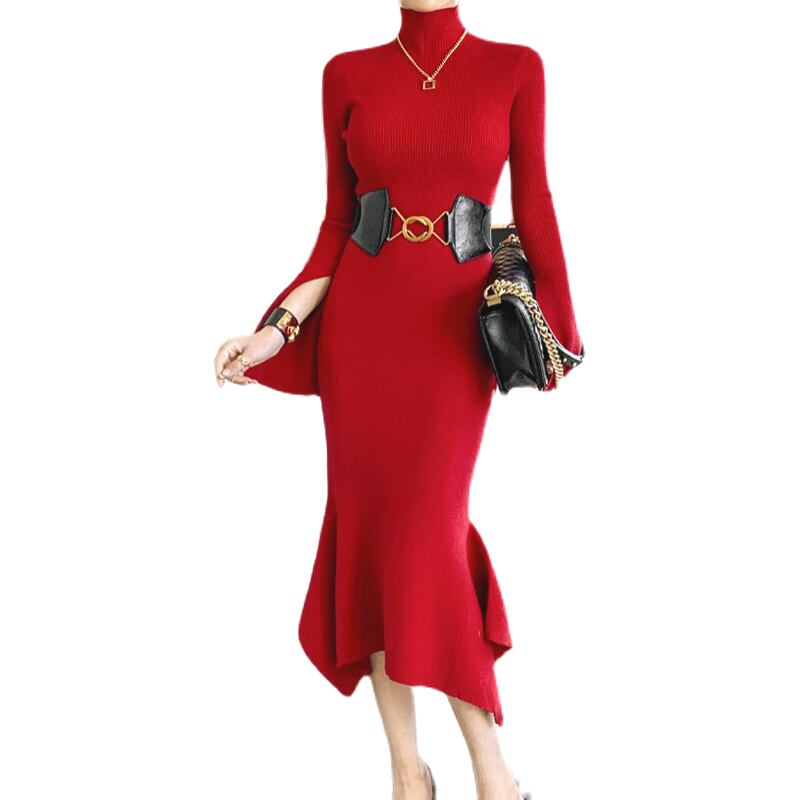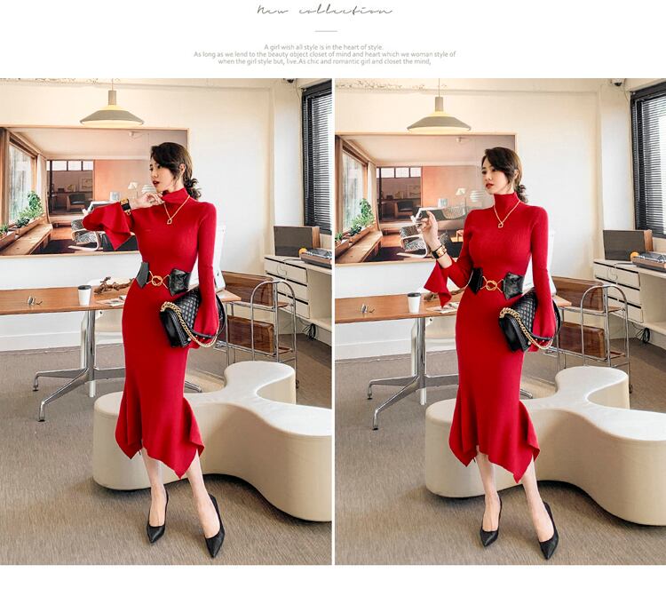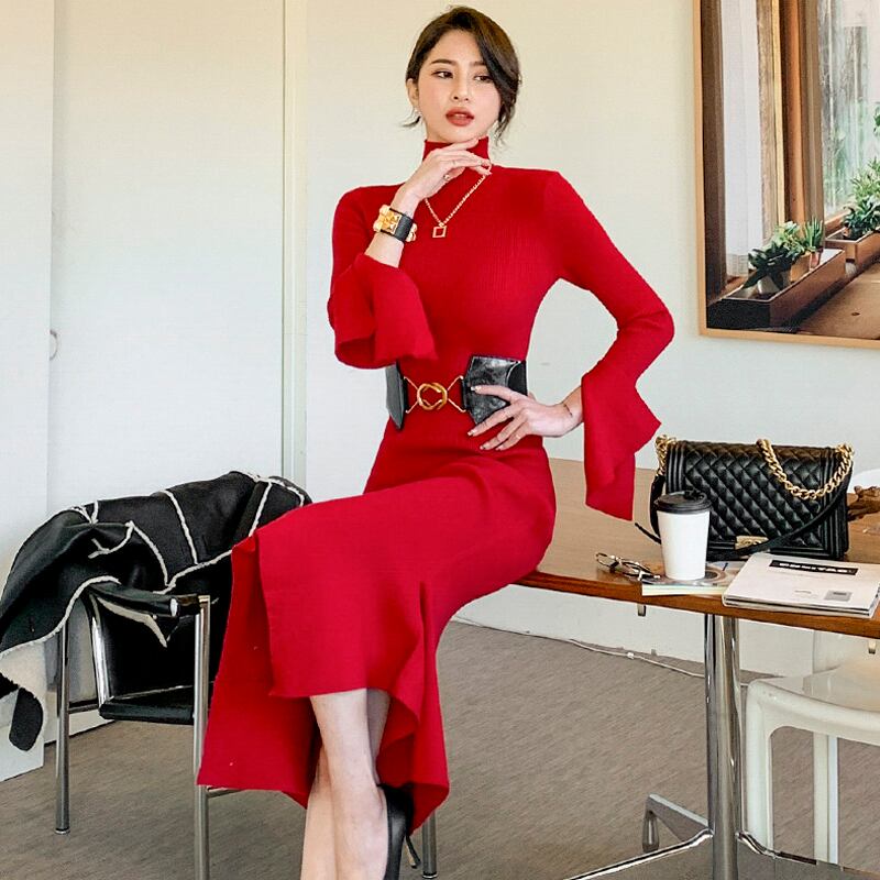 【ベルト付き】ハイネック マーメイドワンピース ニット タイト ニットワンピース パーティードレス ニット ドレス. ワンピース フレアスリーブ スリム ロング. 2カラー a3728