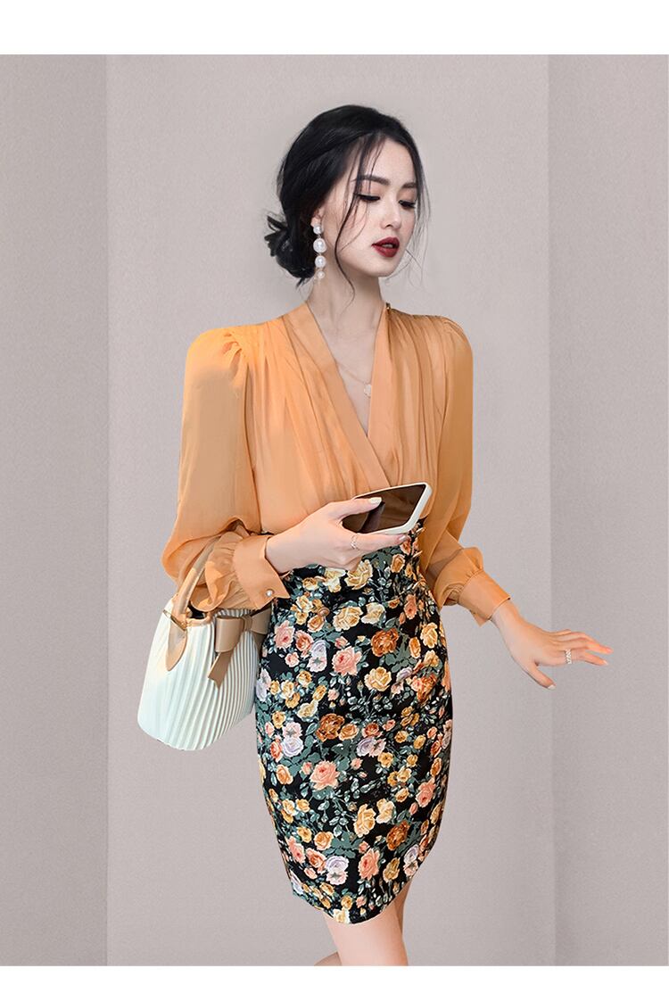 セクシーでレトロクラシカルな花柄シフォンとタイトスカートのドッキングワンピース