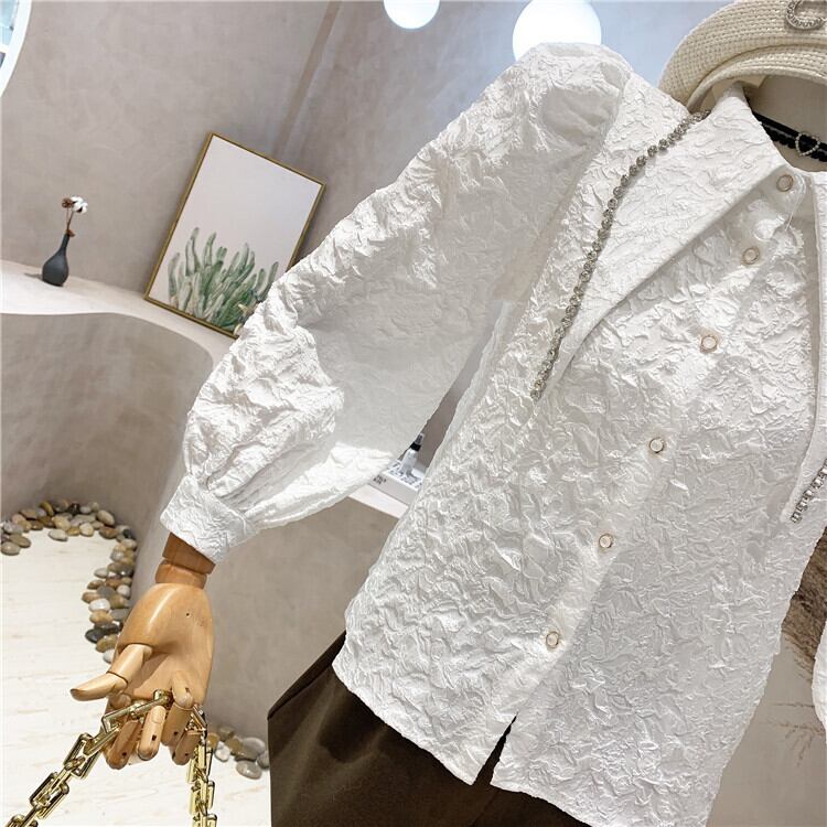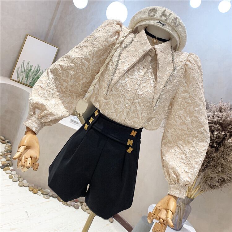大きな襟にラインストーン装飾がオシャレな長袖ブラウス