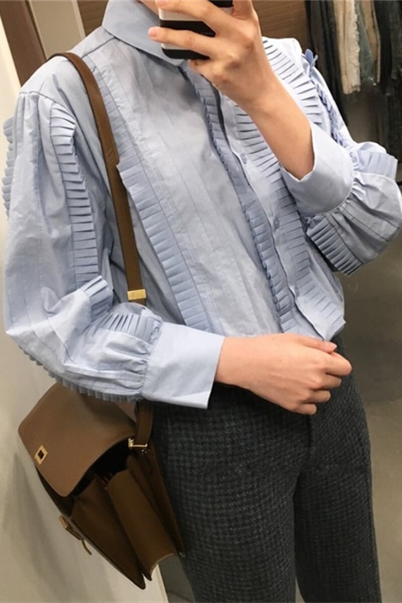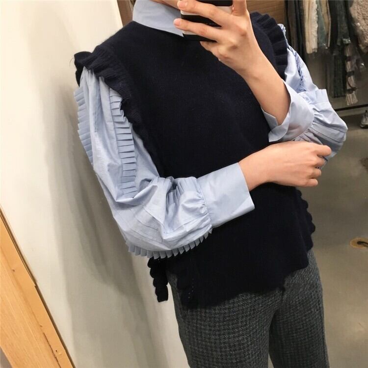 プリーツフリルシャツ 無地 フリルシャツ 長袖シャツ シャツ ブラウス ニットベスト オフィス カジュアル レディース お仕事コーデ a3785