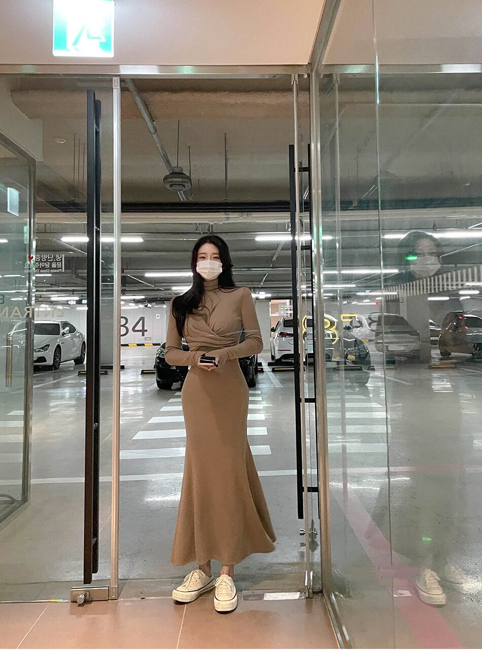 ハイネッククロスワンピース ワンピース カジュアルワンピース マーメイド 長袖 ハイネック ロング丈 クロスデザイン Aラインスカート 無地 レトロ 秋冬 20代 30代 エレガント ショッピング デート a3777