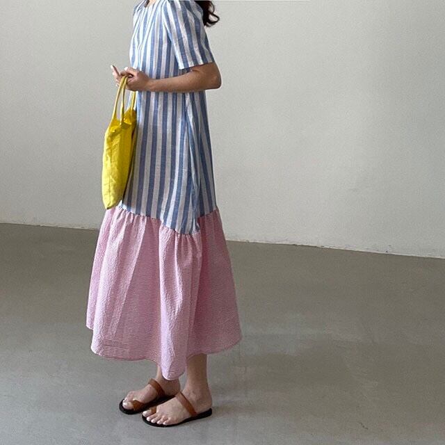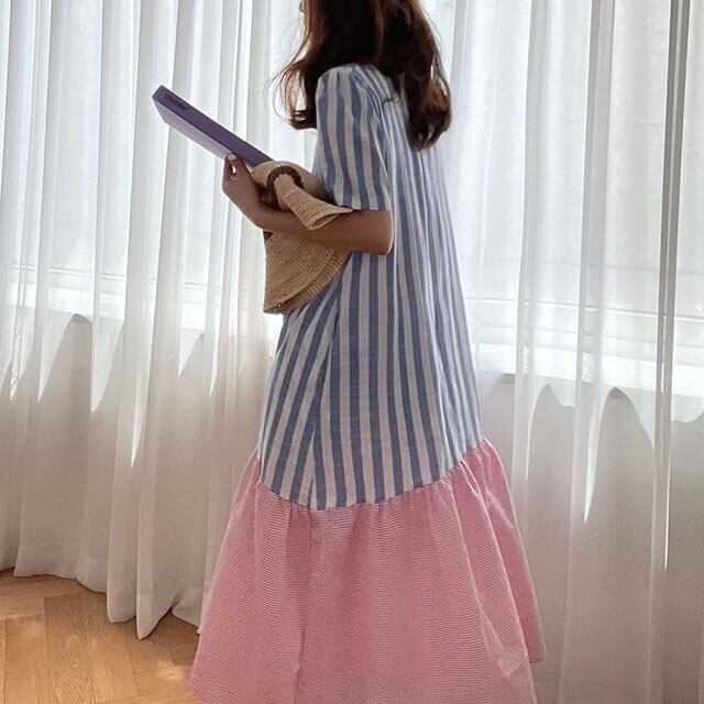 配色ストライプ柄マキシワンピース 半袖ワンピース フリルワンピース ワンピース ドレス ルーズ レトロ ラウンドネック ロングフィッシュテール半袖ドレス a3861