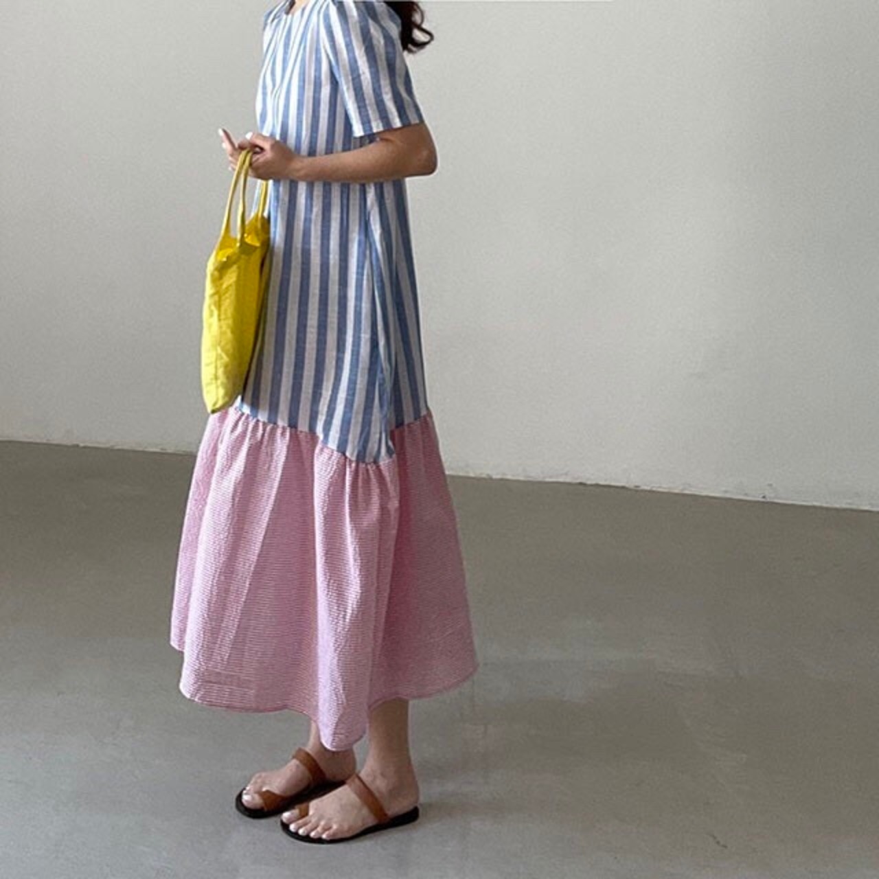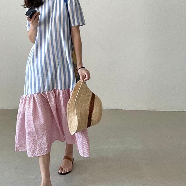 縦ストライプにピンクの横ストライプの配色が可愛い半袖ワンピース