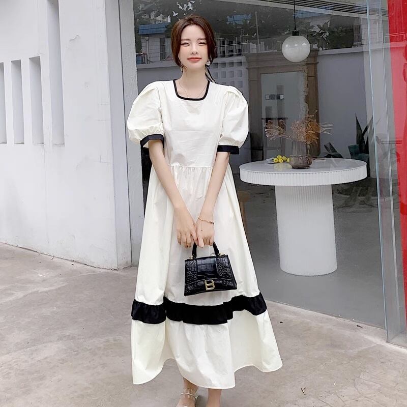 スクエアカラーワンピース 半袖ワンピース ハイウエスト パフスリーブ ワイドワンピース ドレス ワンピース レディース マタニティー 韓国 2カラー a3864