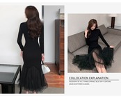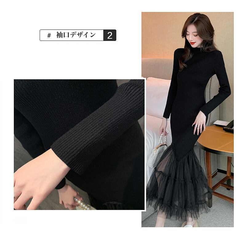 ニットメッシュマーメイドワンピース ニットワンピース メッシュスカート マーメイドスカート ワンピース ニット 異素材 無地 ハイウエスト プルオーバー a3892
