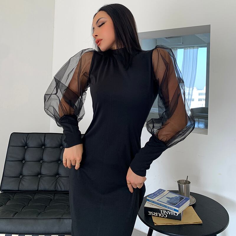 シースルースリーブ ブラックドレス ミモレワンピース ドレス. ワンピース 長袖ワンピース バックスリット ハイウエスト セクシー パーティー お呼ばれ a3971