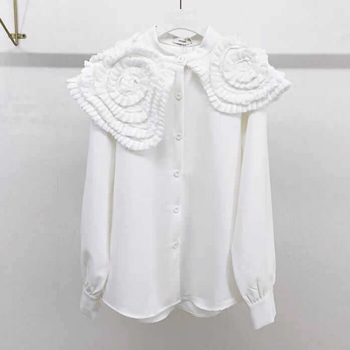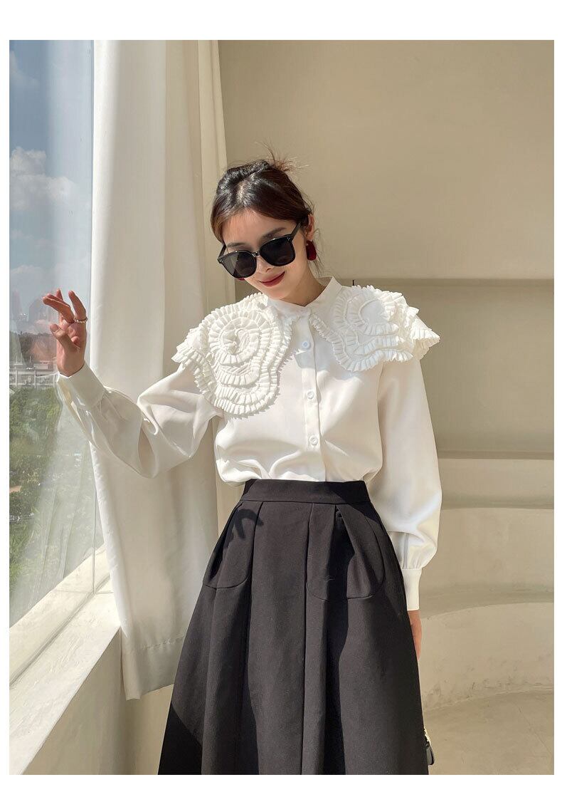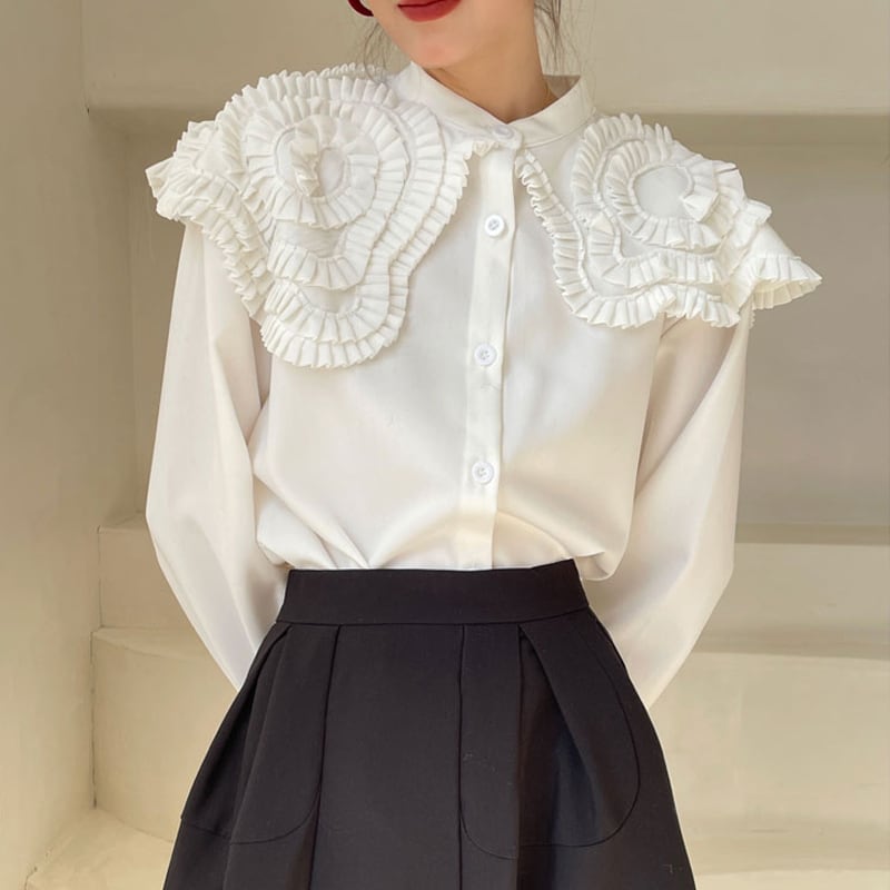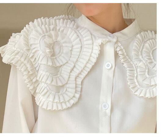 花びらのようなフリルカラーが印象的なプリーツフリル襟ブラウス
