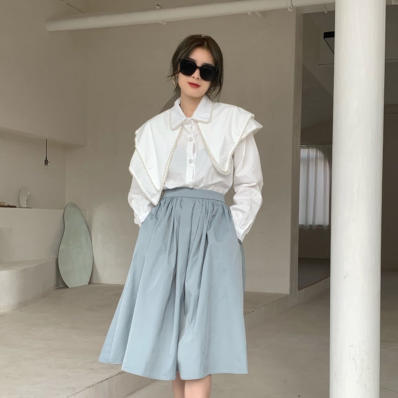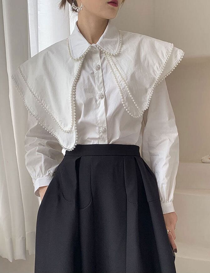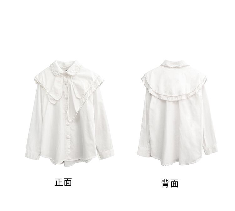 2層ビーズビックカラーブラウス ビーズネック フリルブラウス 長袖 ブラウス シャツ ホワイト ガーリー モード系 レディース オフィスコーデ ビーズラペル a3963
