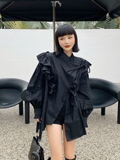 ふんだんに使われたフリルが印象的なフリルレースアップブラウス