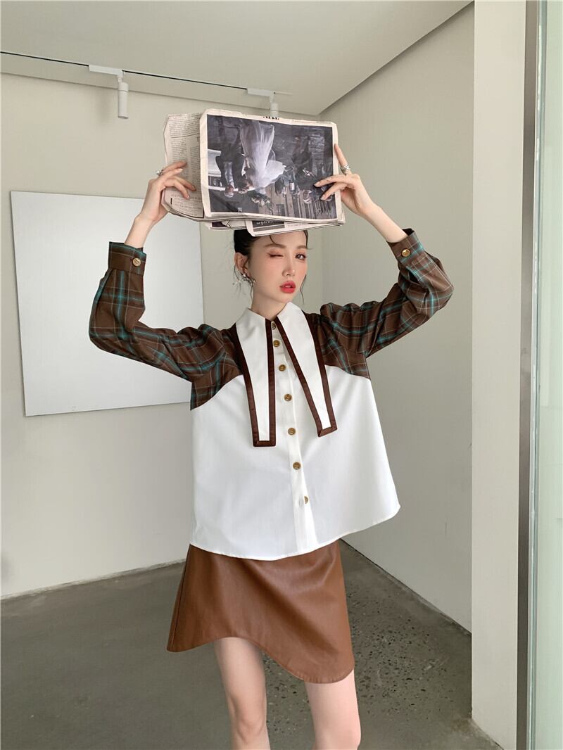 チェック柄カラーシャツ ブラウス 長袖 シャツ 長襟 チェック柄 レトロ 切替 長袖 マニッシュ ショート丈 フロントボタン レディース オフィスコーデ a3966