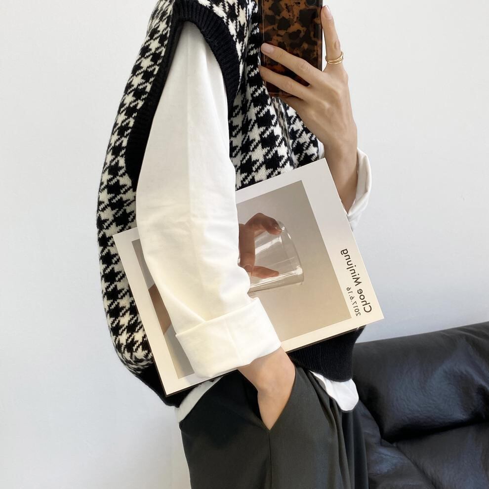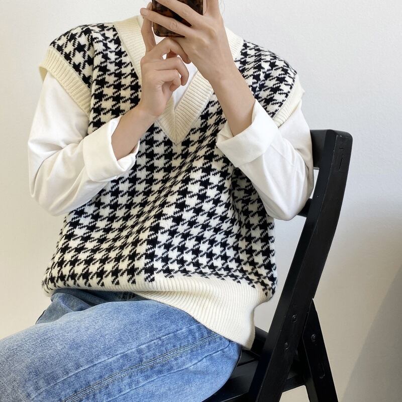 Vネック千鳥格子ニットベスト ニットベスト ベスト チェック柄 セーターベスト レディース ノースリーブ ベストジャケット 学生. オフィスコーデ オルチャン 2カラー a3975