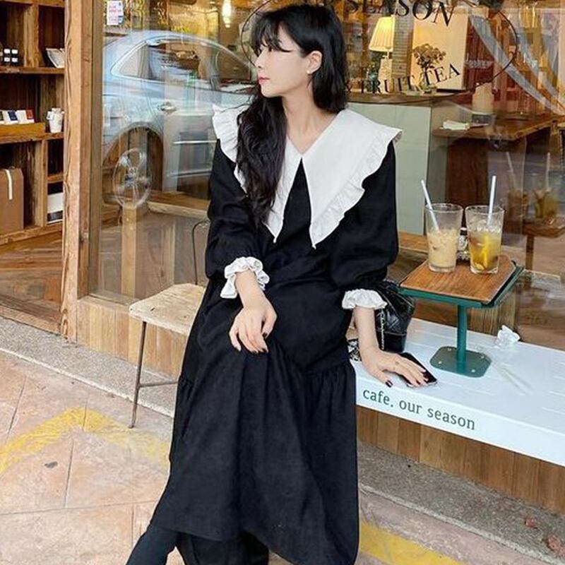ビッグフリルカラー ロングワンピース フリルワンピース 長袖ワンピース ワンピース ドレス ルーズ パフスリーブ フレンチ レディース 2カラー a3994