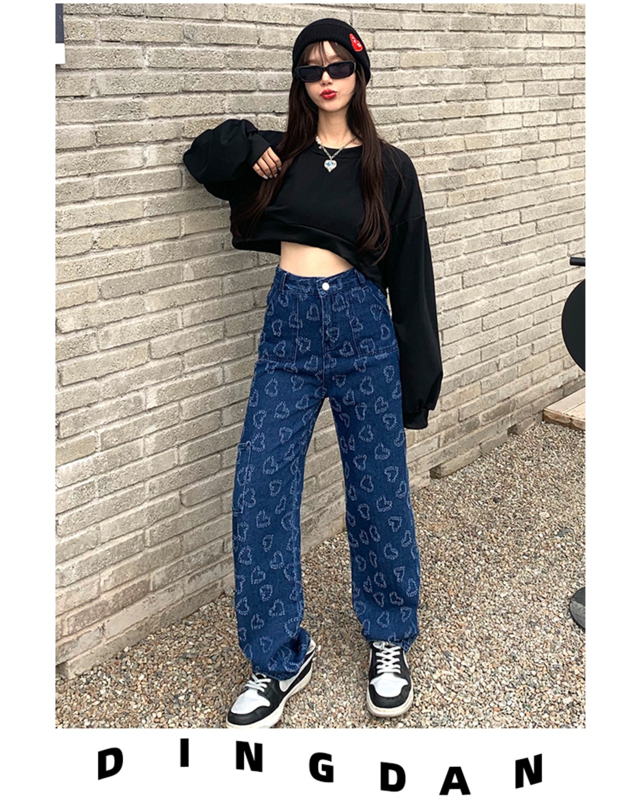 ハート柄 ストレートジーンズ プリントジーンズ ストレートデニム ハイウエスト ジーンズ デニム ボトム レディース アメカジ カジュアル ストリート a4022