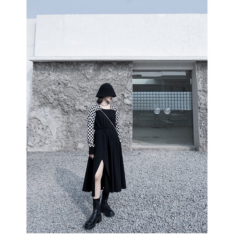 レイヤードワンピース ドッキングワンピース フェイクツーピース ワンピース スリットワンピース 長袖 大きいサイズ レディース モード系 マタニティー オフィスコーデ Aライン長袖ワンピース 2カラー a4028