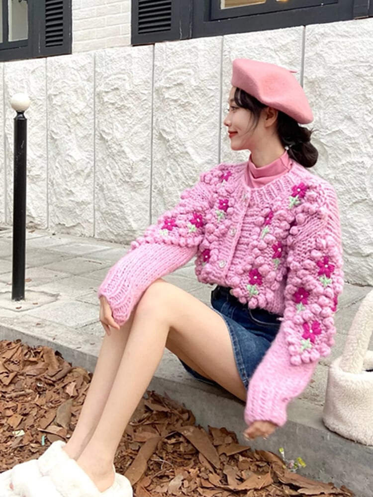 立体刺繍フラワーニットカーディガン セーター カーディガン ニット レディース ピンク ショート セーターコート ガーリー かわいい a4035
