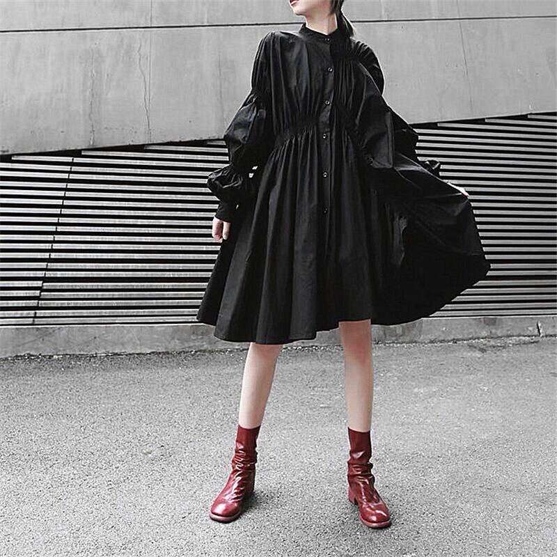 ボリューム袖 シャツワンピース オーバーサイズ トップス シャツ ワンピース シャツワンピ ひざ丈 膝丈 襟なし バンドカラー ボリューム袖 アシンメトリー アシメ フレア ギャザー 主役級 クール スタイリッシュ モード系 体型カバー 春 夏 秋冬 秋 冬 韓国 大人かわいい 5カラー a4062
