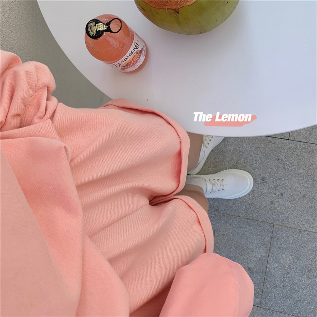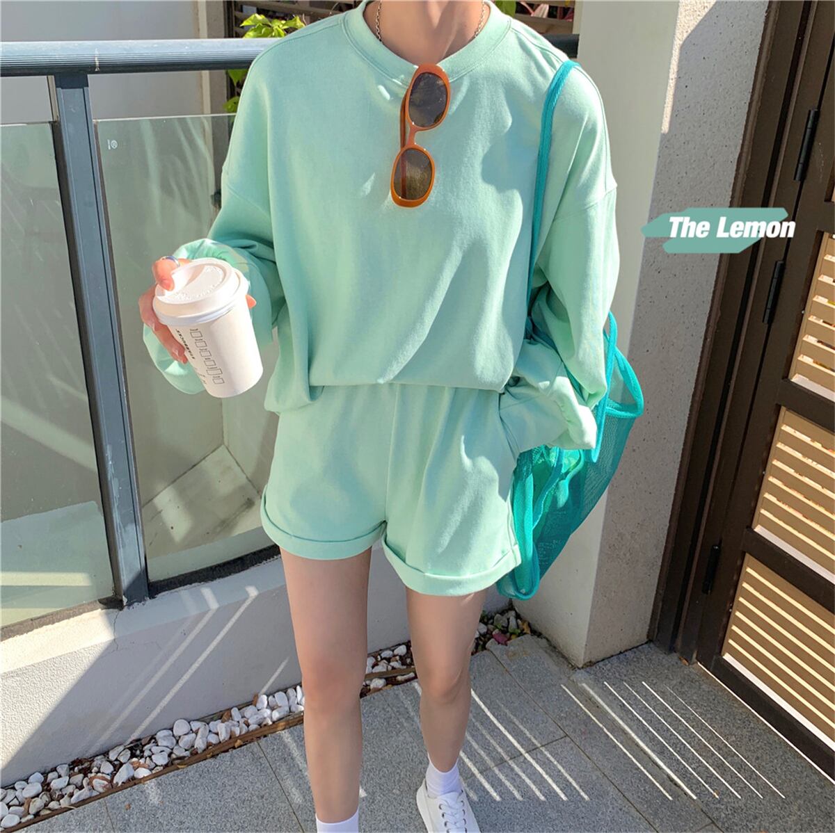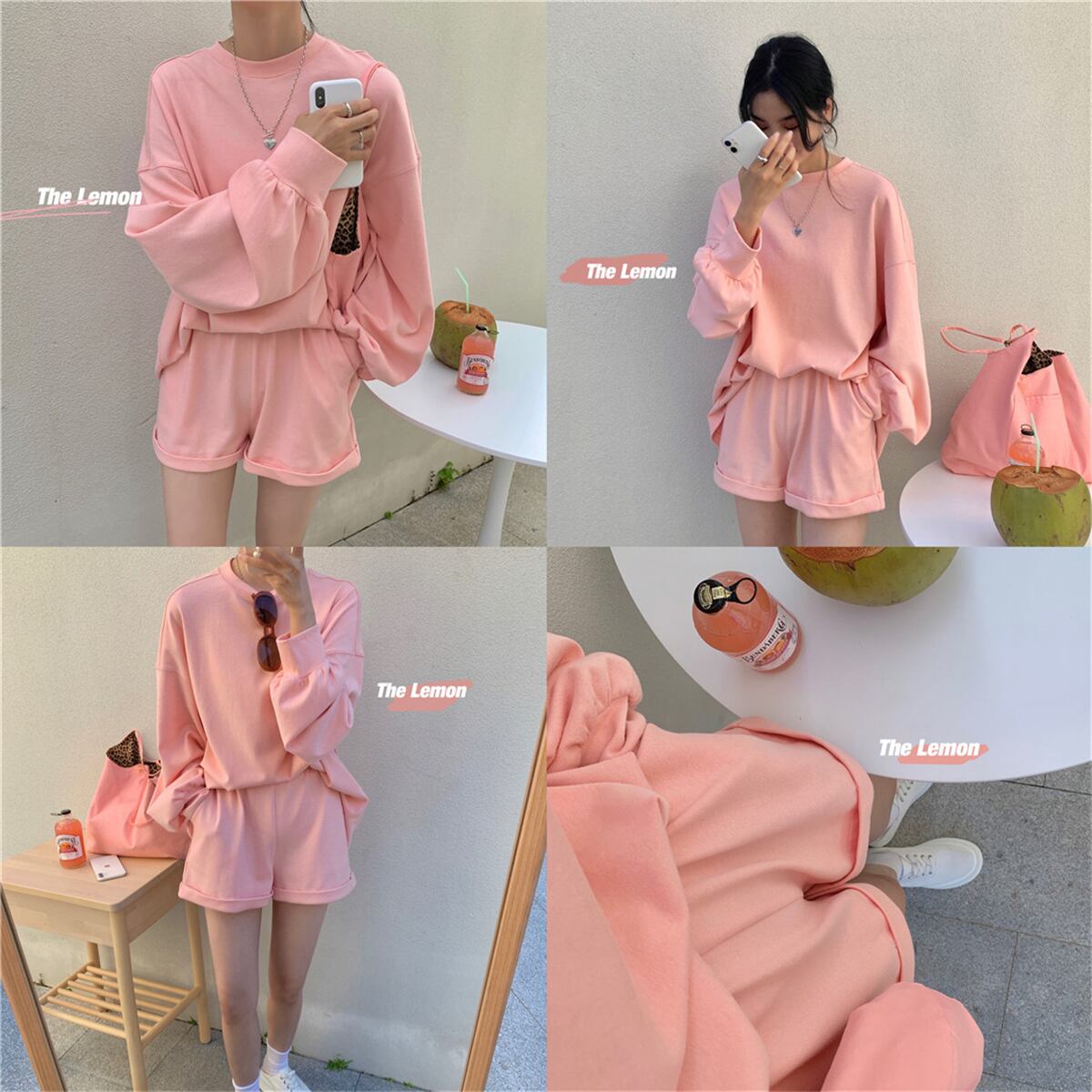 ゆったりとしたシルエットで着心地が良い、同素材のトレーナーとショートパンツのセットアップ