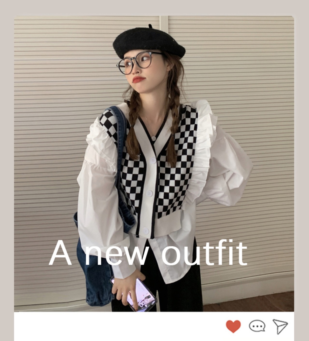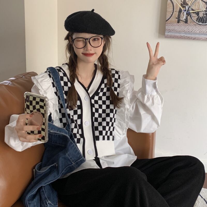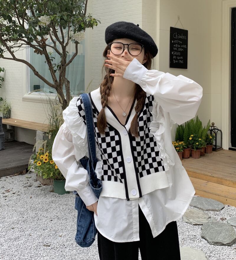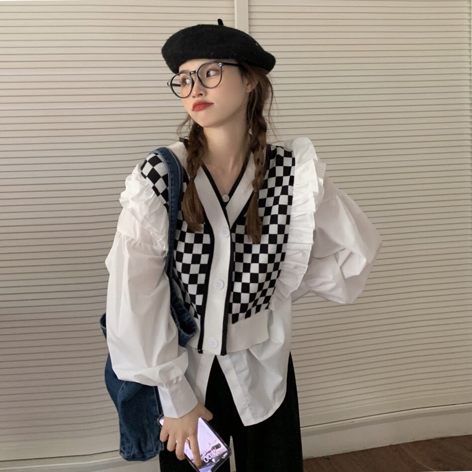 異素材MIXブラウス レイヤード風 チェッカー柄 Vネック フェイクツーピース シャツ フリル ブラウス ベスト 長袖 カジュアル ガーリー 韓国 オルチャン a4092