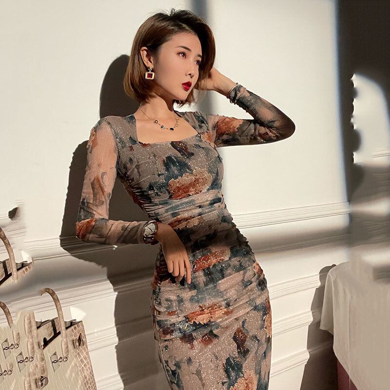 フラワーロングドレス ドレス 長袖 ワンピース エレガント シアー感 スクエアネック ハイウエスト スリムドレス パーティー お呼ばれ a4137