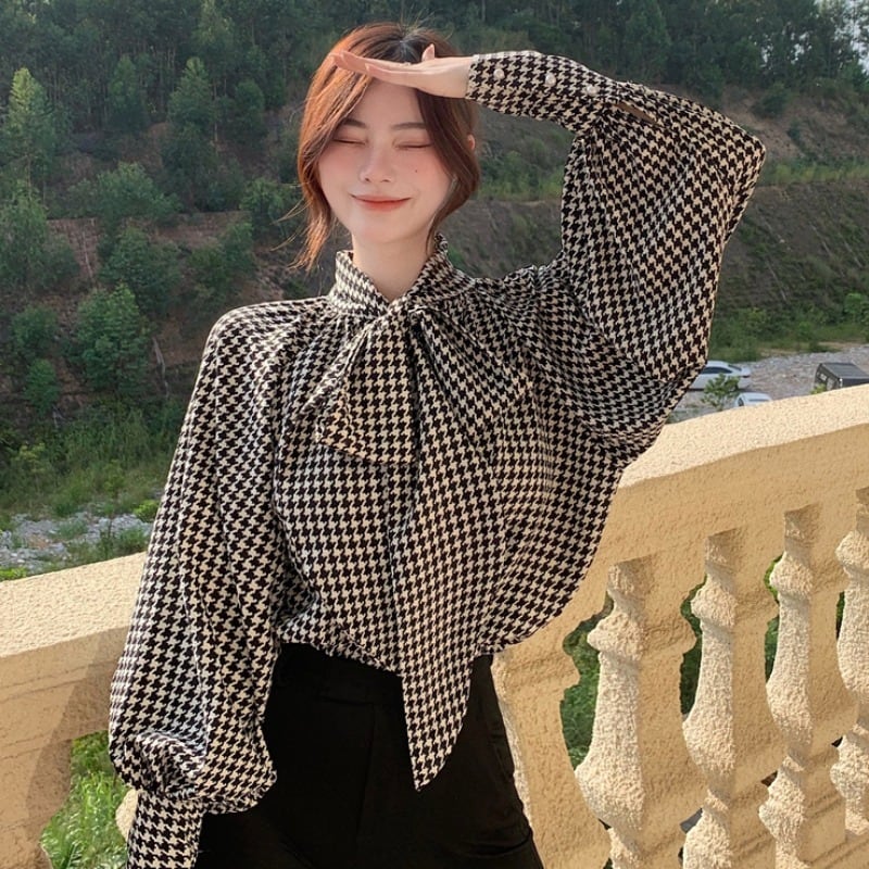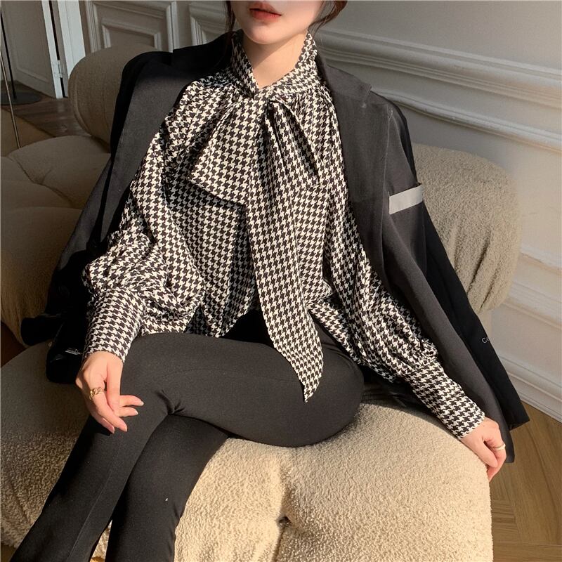 千鳥柄でクラシックな印象のボウタイブラウス。
