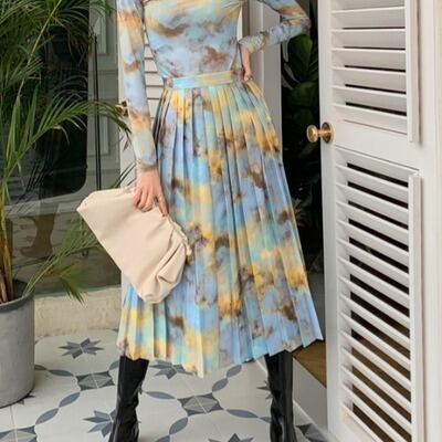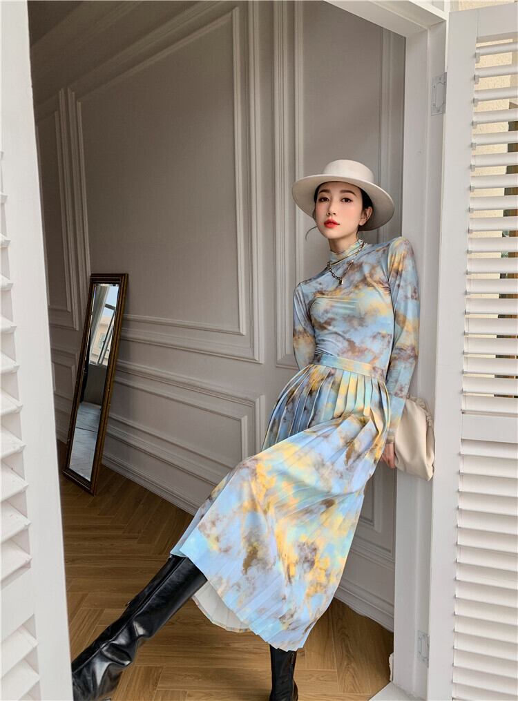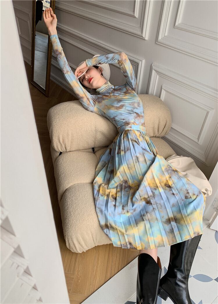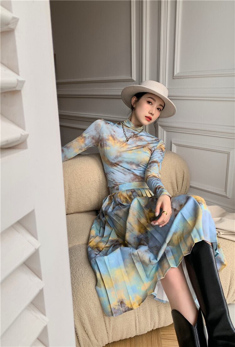 【バラ売り】タイダイプリント プリーツスカート ボトミングシャツ長袖Tシャツ プリーツフレアスカート ボトミングシャツ ツーピース a4201
