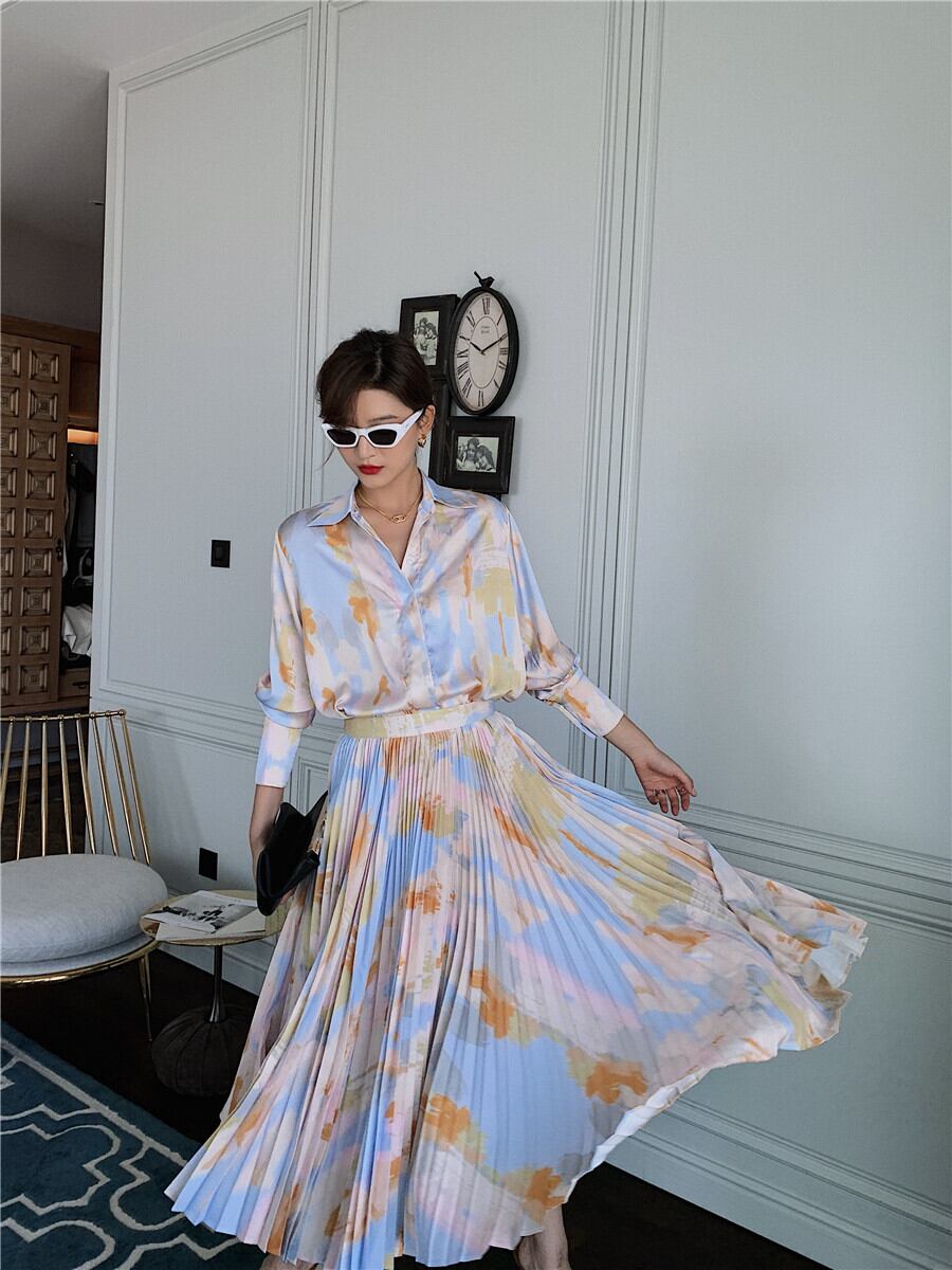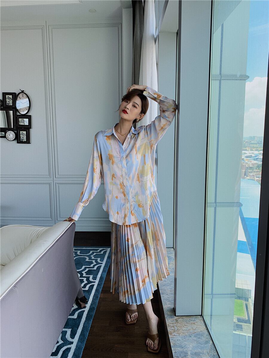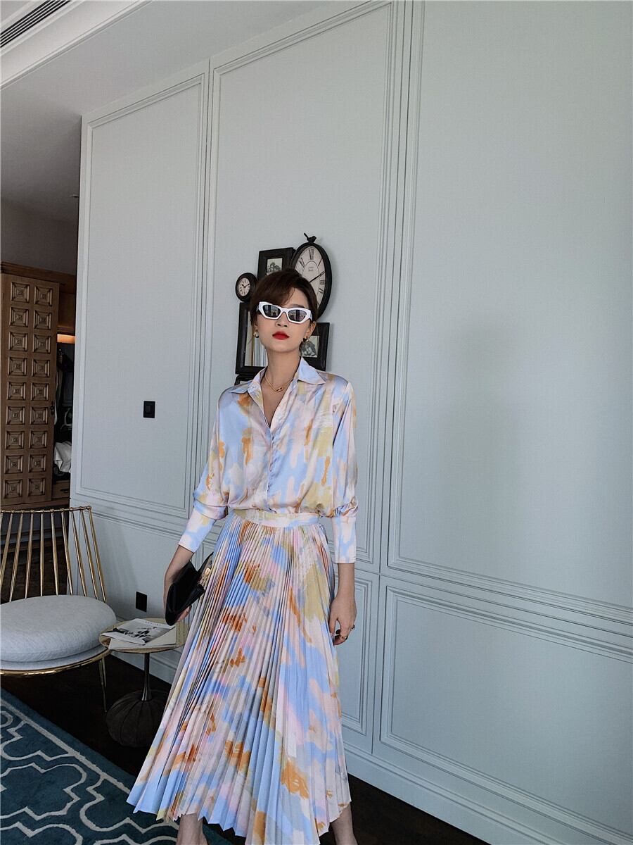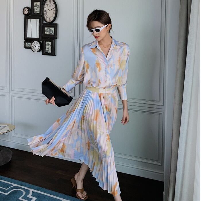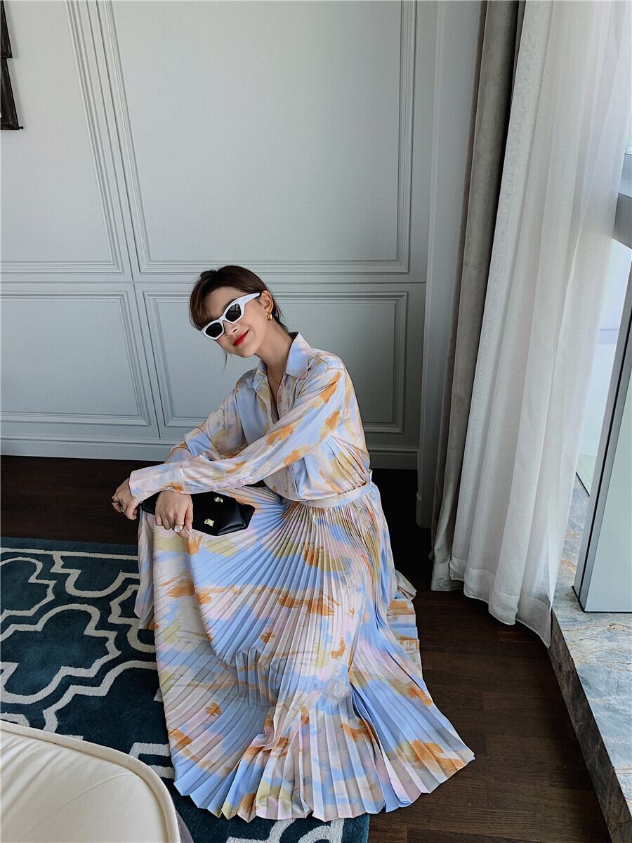 【セットアップ】スマッジプリント プリーツスカート+長袖シャツ ツーピース ワンピース プリーツフレアスカート シャツ ブラウス a4205