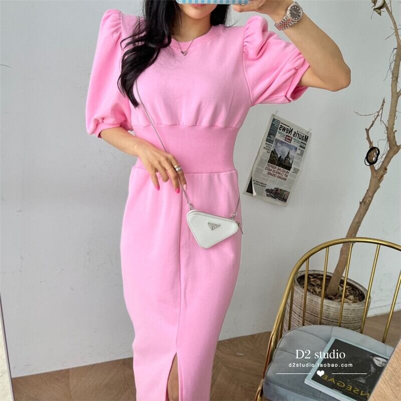パフスリーブワンピース 半袖ワンピース パフスリーブ ワンピース Tシャツワンピ ハイウエスト オルチャン 韓国 ロング丈 ウエストシャーリング カジュアル デート 大人 リゾート 3カラー a4226