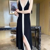 バイカラーニットワンピース タイト スリット ロング丈 リブニット きれいめコーデ ニットワンピース a4236