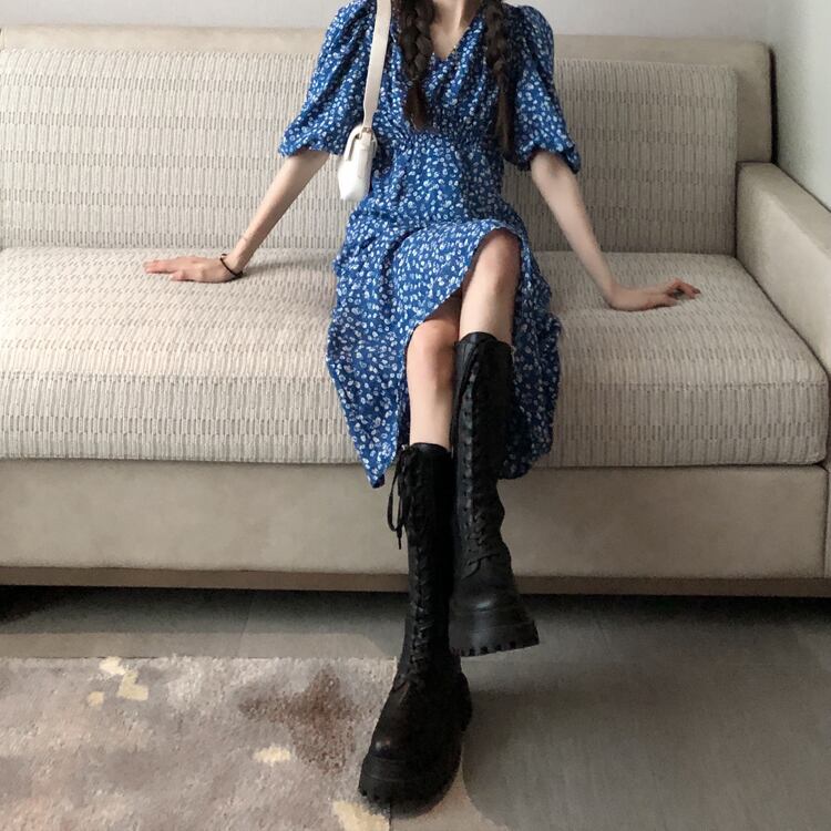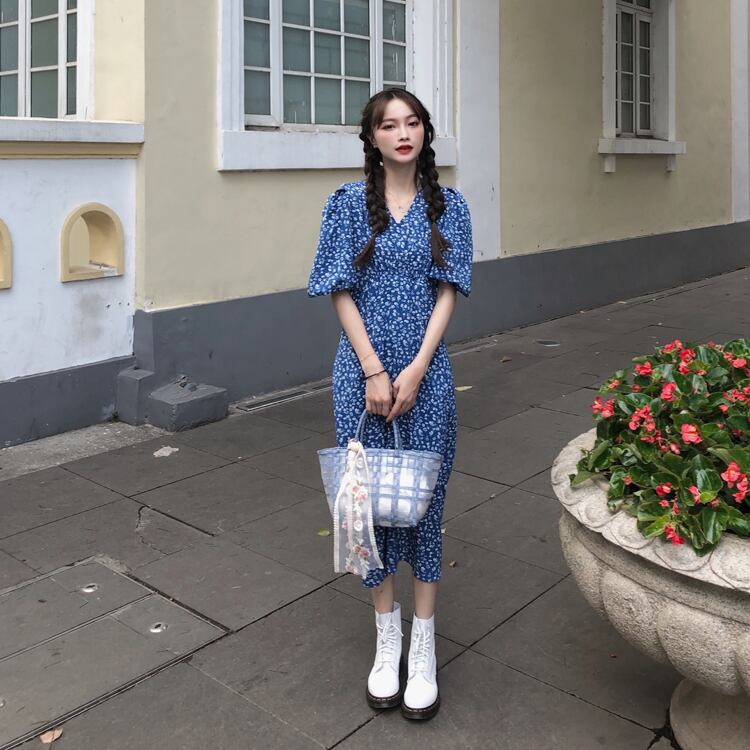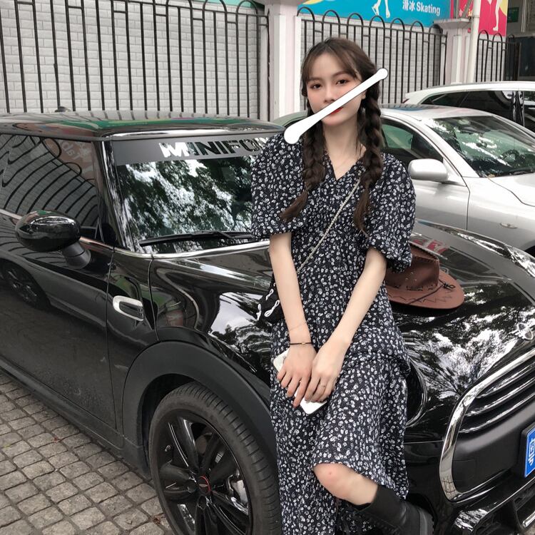 Vネックフラワーワンピース パフスリーブ 花柄 フローラルドレス ワンピース ドレス 半袖 レディース オルチャン a4258