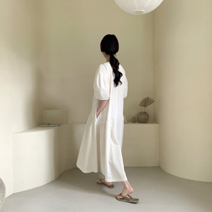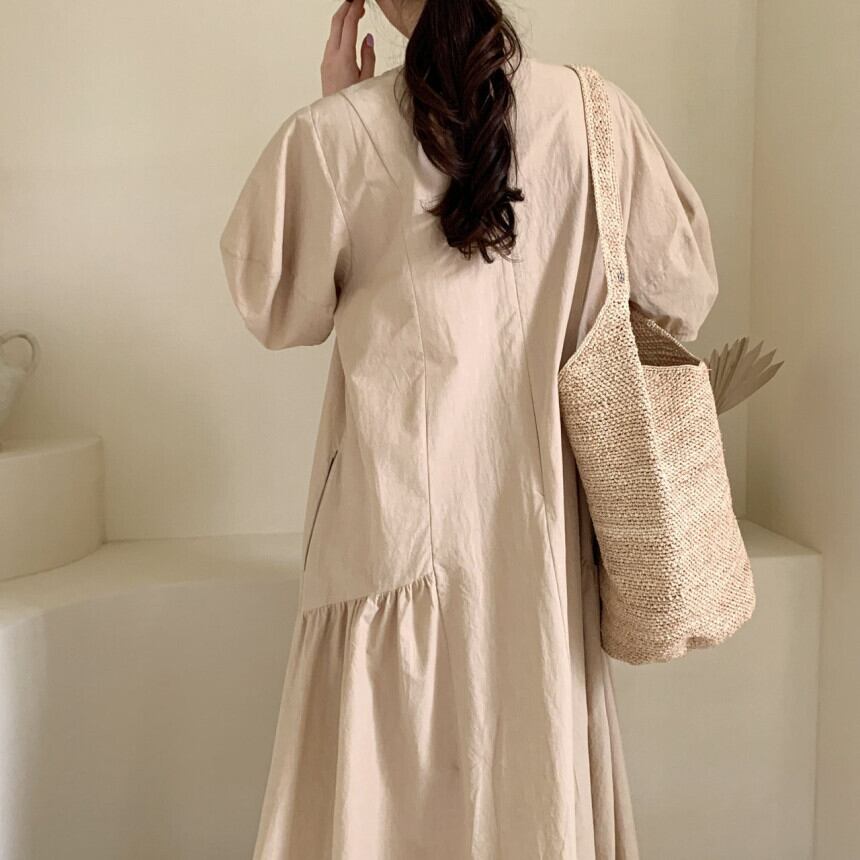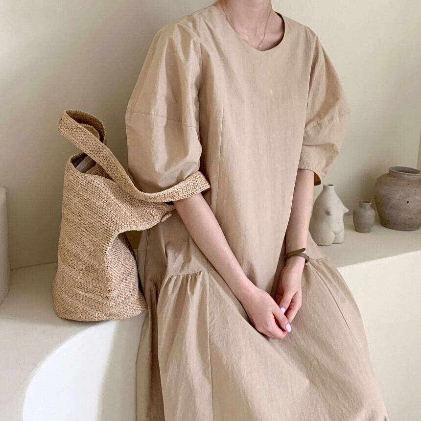 パフスリーブワンピース 切り替え半袖マキシワンピース 半袖 ワンピース ドレス ルーズ ゆったり 薄手 シンプル ラウンドネック 3カラー a4263
