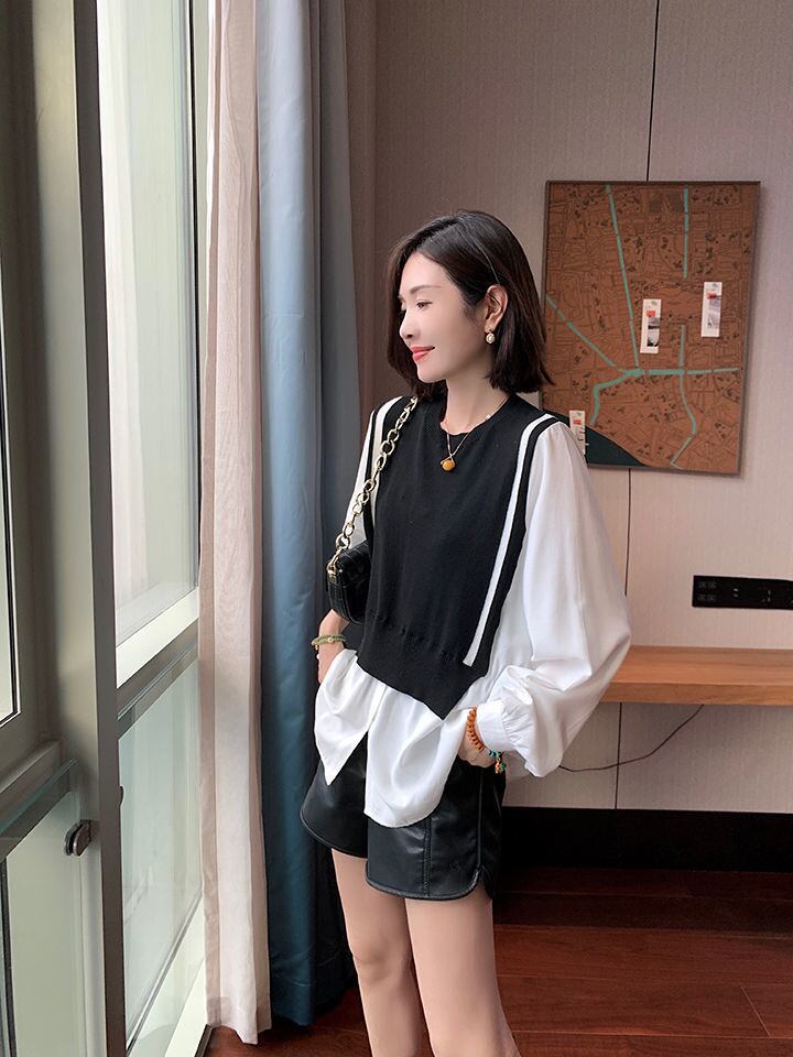 【大きいサイズあり】レイヤードシャツ. ドッキングトップス ニット シャツ フェイクツーピース 長袖 ラウンドネック レディース オフィスコーデ モノトーン a4266