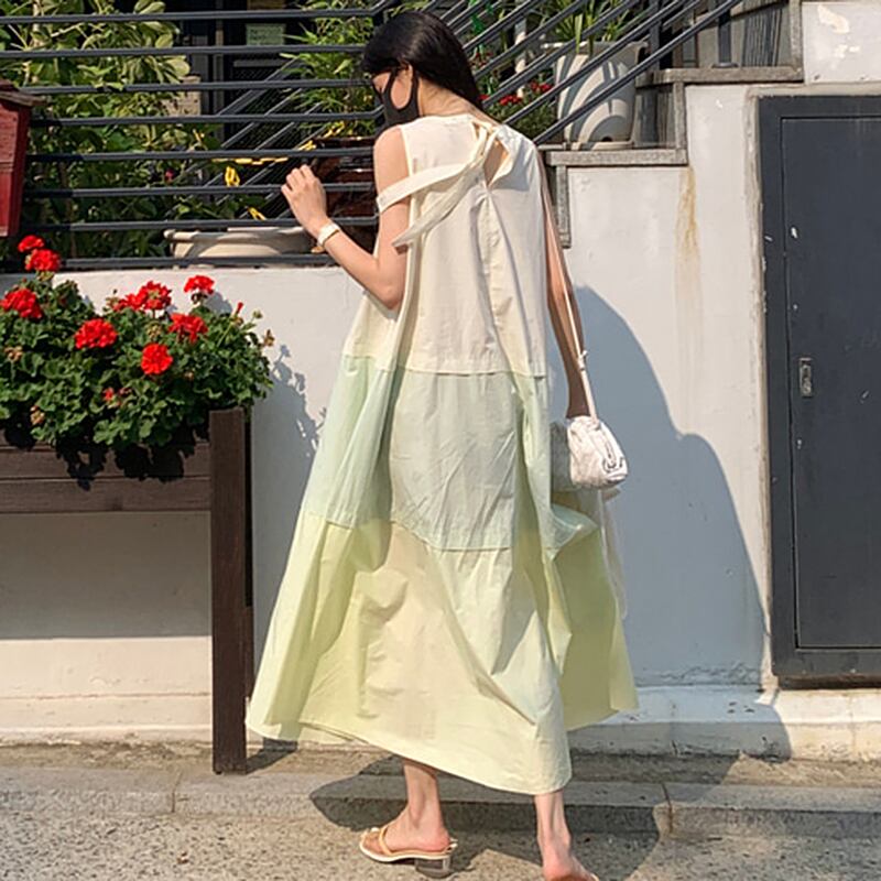レイヤード ノースリーブワンピース バイカラー ティアードワンピース ノーカラー フレア マキシ丈 カジュアル ノースリーブ a4300