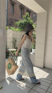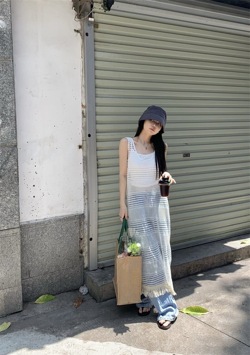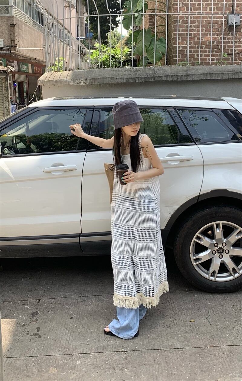 【2点セット】ノースリーブメッシュフリンジワンピース+タンクトップ