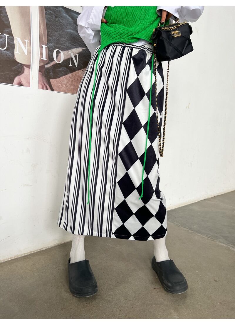 チェック柄×ストライプ スカート スプリット ストレートスカート ミドル丈 スカート レディース ハイウエスト 2カラー a4328