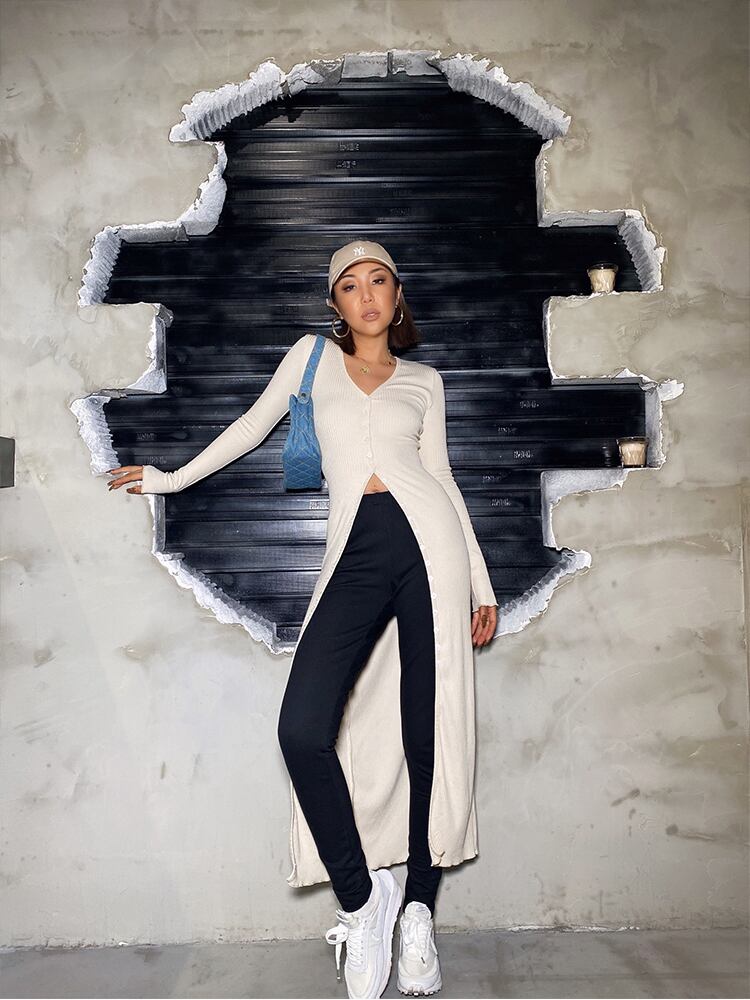ロングワンピースのように着たり、ボタンをあけて羽織りロングカーディガンのようにも着れる、2WAYで着れるVネックリブニットワンピース
