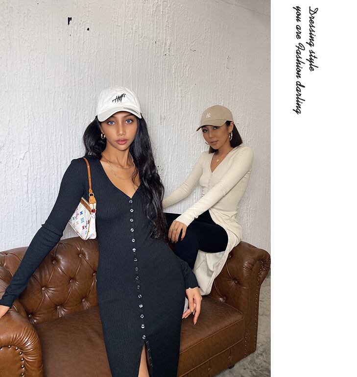 Vネックリブニットワンピース リブニットワンピース 長袖 カーディガン ワンピース ドレス レディース ミモレ丈 アメカジ カジュアル ストリート 2カラー a4331