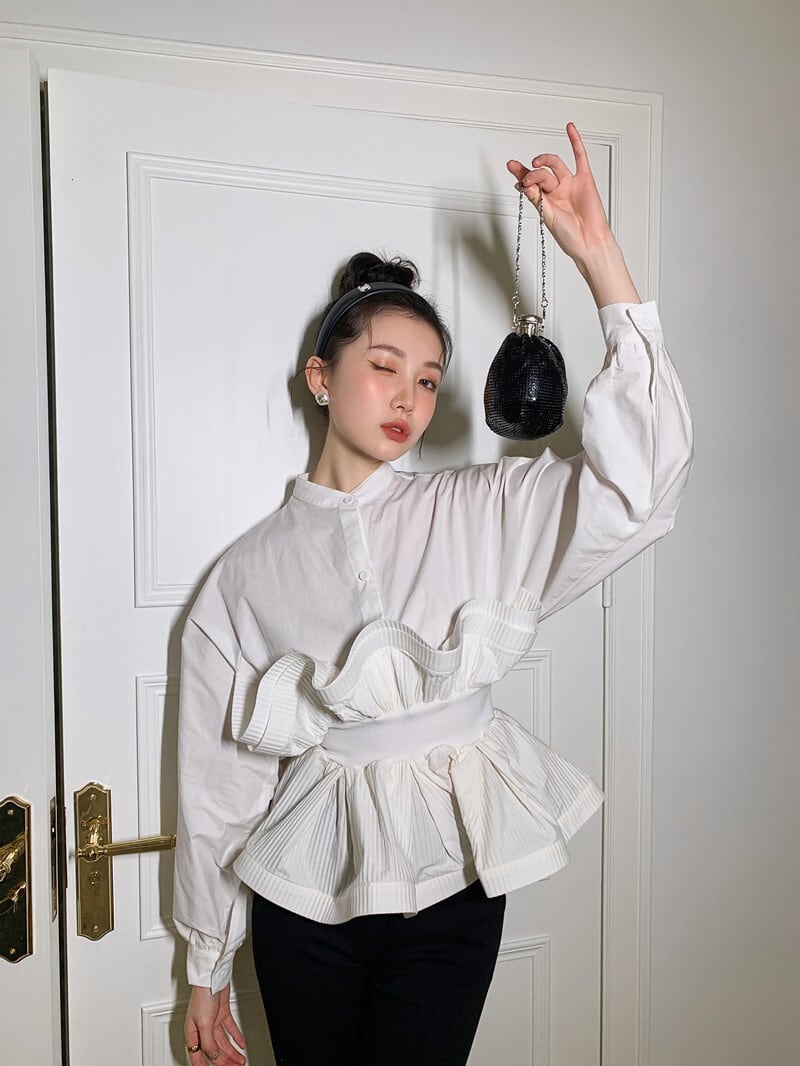 大ぶりなウエストフリルが魅力的な長袖ブラウス