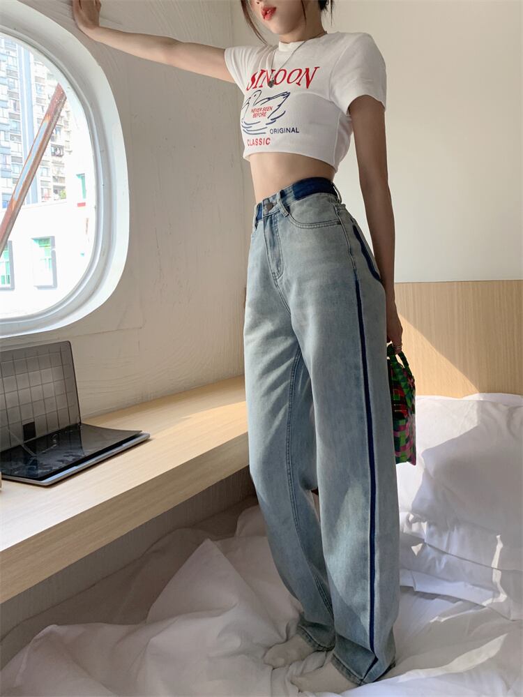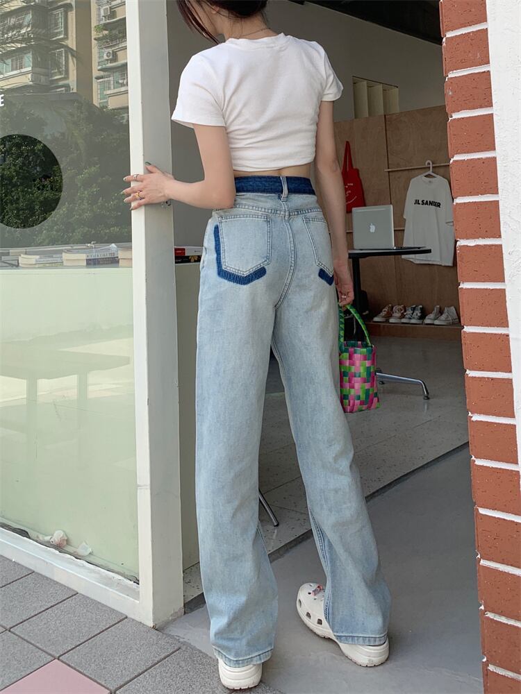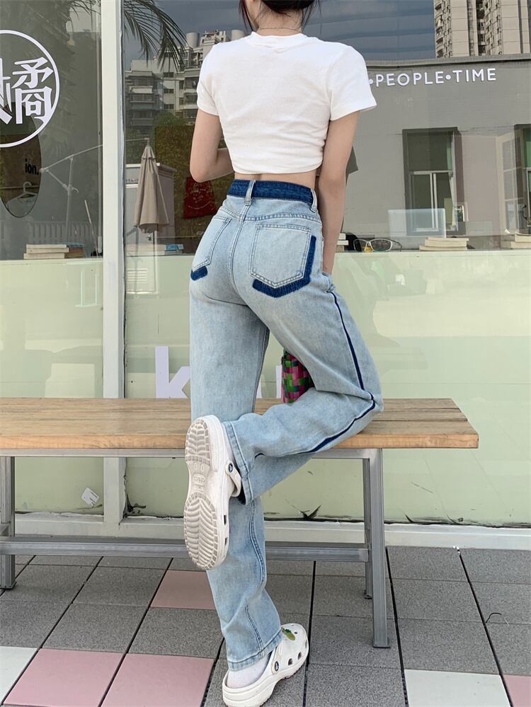 コントラストカラーストレートジーンズ ジーンズ デニム ストレートジーンズ レディース ハイウエスト ボトムス 美脚 ストレートパンツ a4349