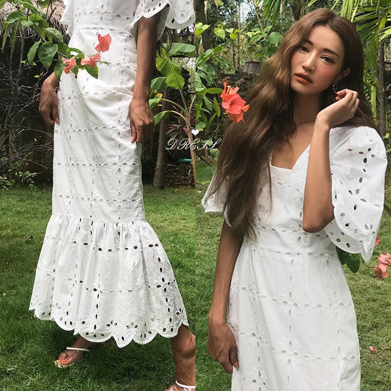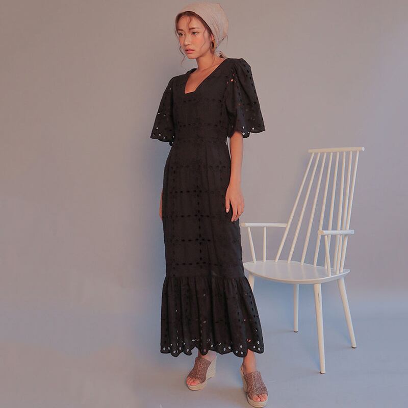 パンチングレースワンピース マーメイドワンピース レディース レース ロングワンピース 半袖マキシ ワンピース 半袖 レース 夏 コットン きれいめ ロング フリル 2カラー C28
