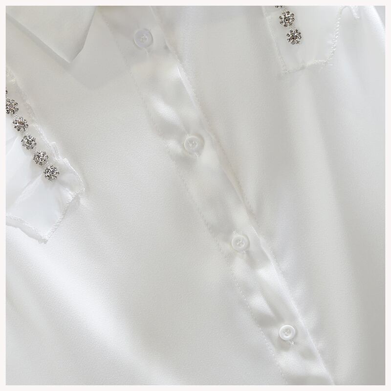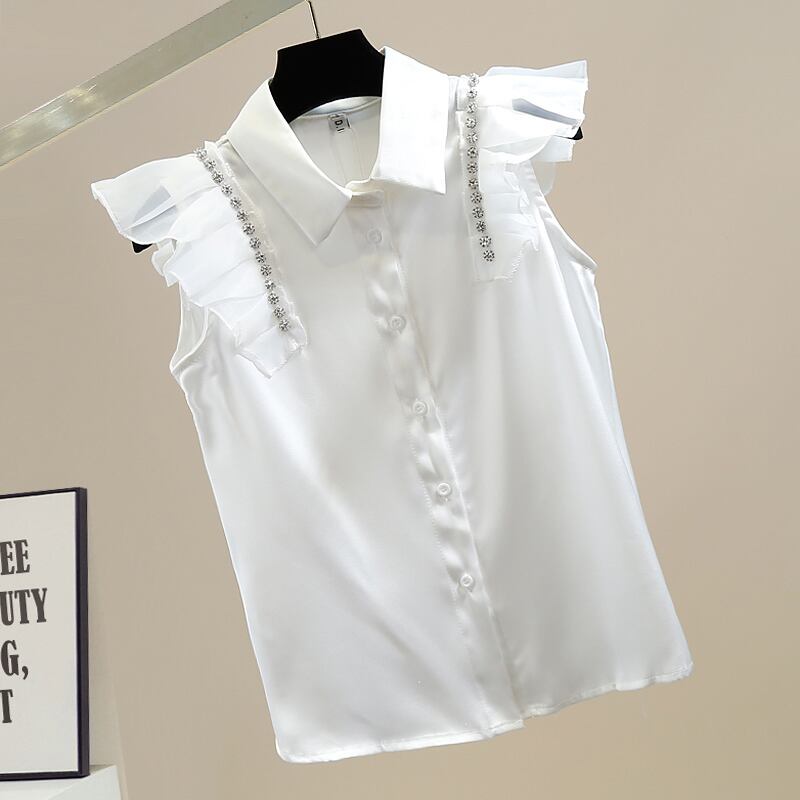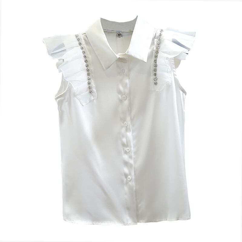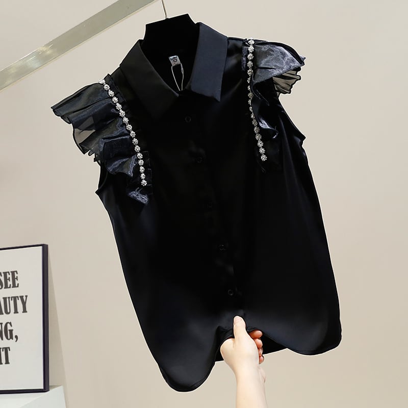 ラインストーン ノースリーブ サテンシャツ ブラウス フリルスリーブ ノースリーブシャツ ノースリーブブラウス レディース ママコーデ お仕事コーデ オフィス 春 夏 秋 a4358