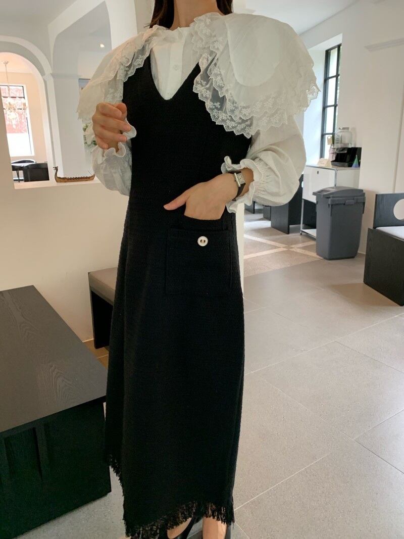 【セット】BIGレースカラーブラウス +フリンジツイードワンピース パフスリーブ ツイードワンピース フレンチ ブラウス シャツ CC41