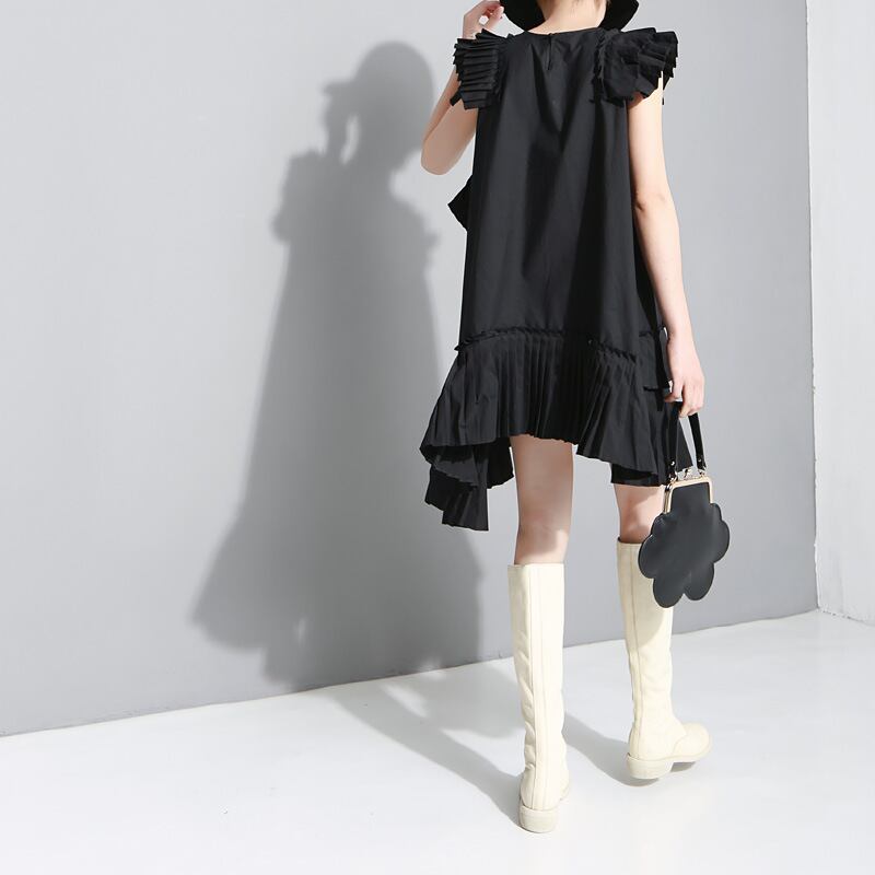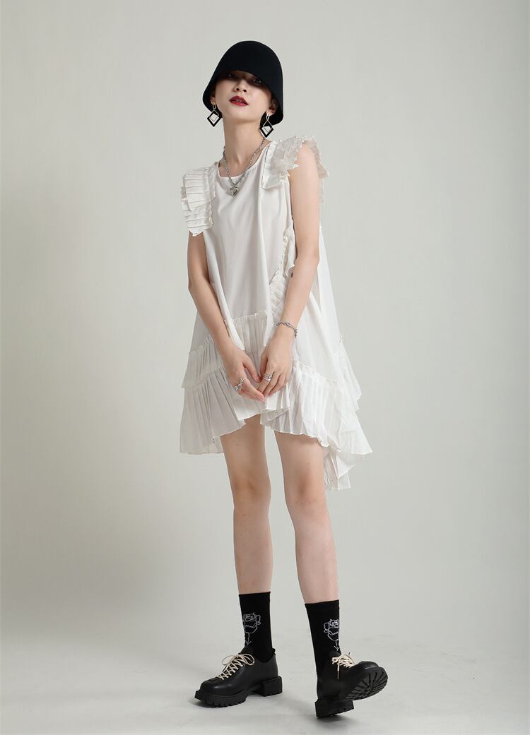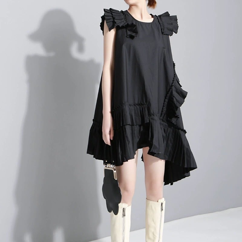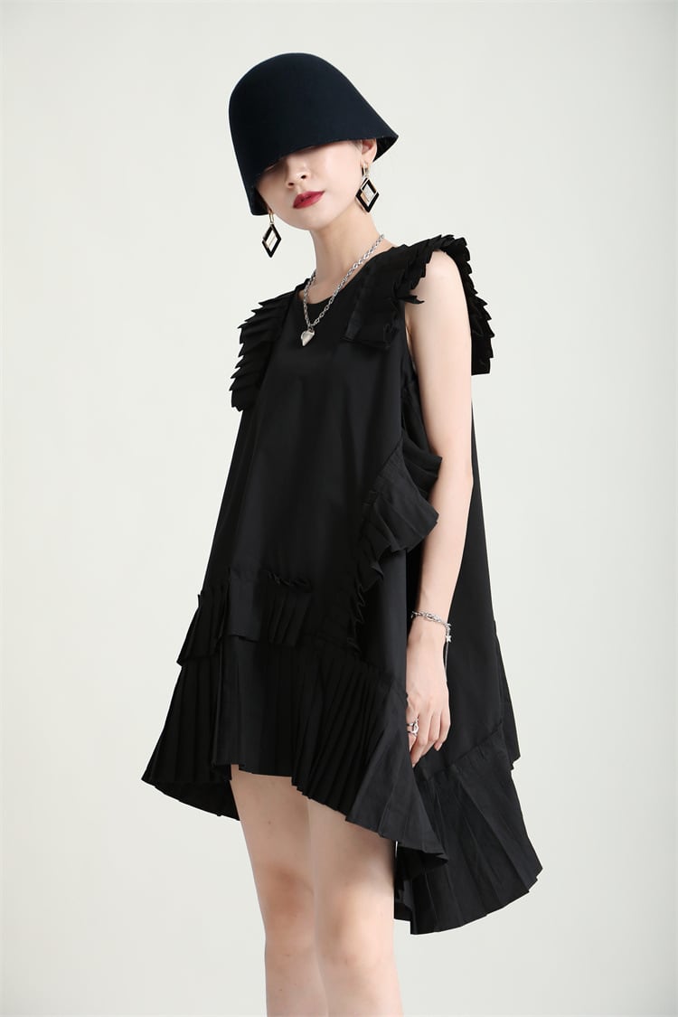 プリーツフリルワンピ 袖なし チュニック ひらひら フリル ワンピース モノトーン 無地 シンプル 変形 アシメ 個性的 袖なし ブラウス 丈長め お尻カバー ガーリー 涼しい 夏服 かわいい Aライン 脚長 モテ服 ギャザー プリーツ カジュアル 着やすい 2カラー a4391