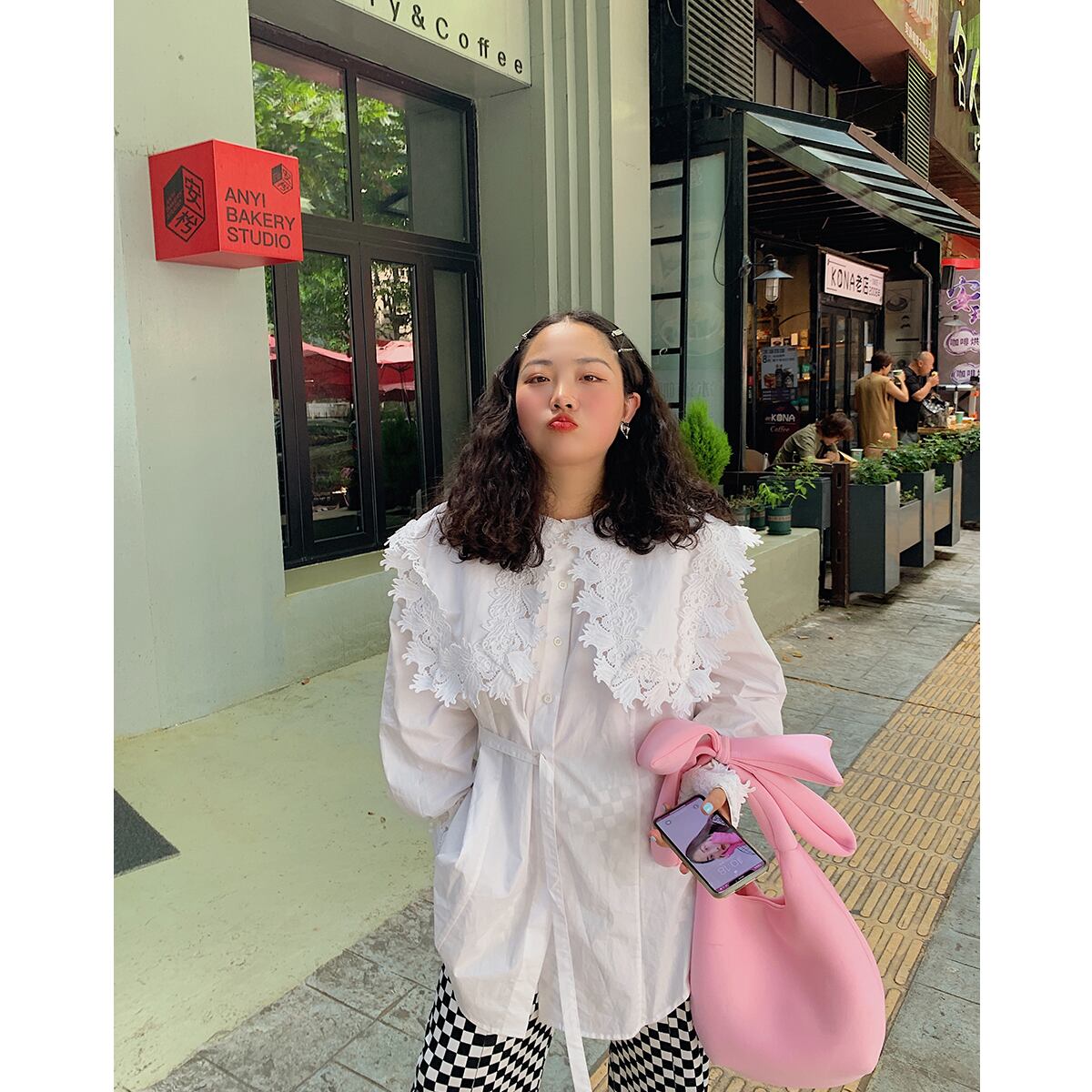 BIGレースカラーブラウス シャツ ブラウス 襟付き ボリュームスリーブ ロングシャツ レディース モード系 ママコーデ オフィスコーデ 長袖 C44